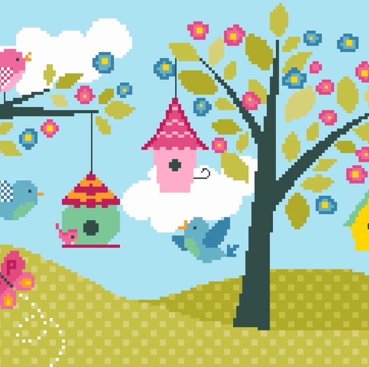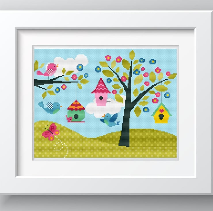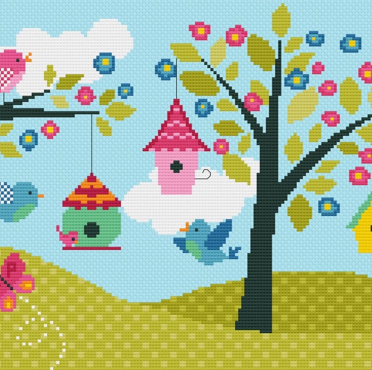 Cross stitch pattern 190 - Cute Bird Houses & Flower Blossom - Home sweet home children's nursery - colourful cross stitch/tapestry PDF chart by Vivsters. No delivery costs - PDF counted chart file straight to your inbox. Start stitching straight today!