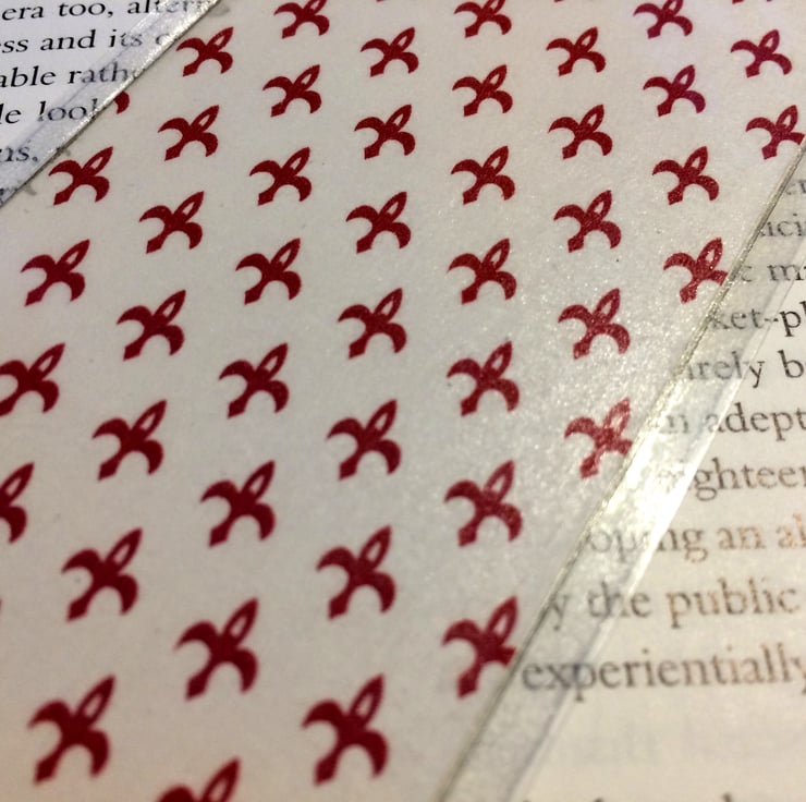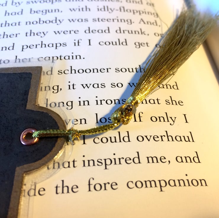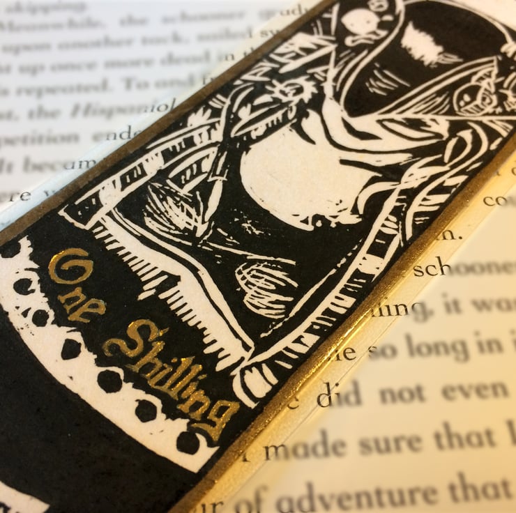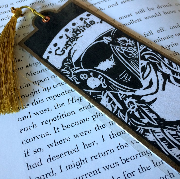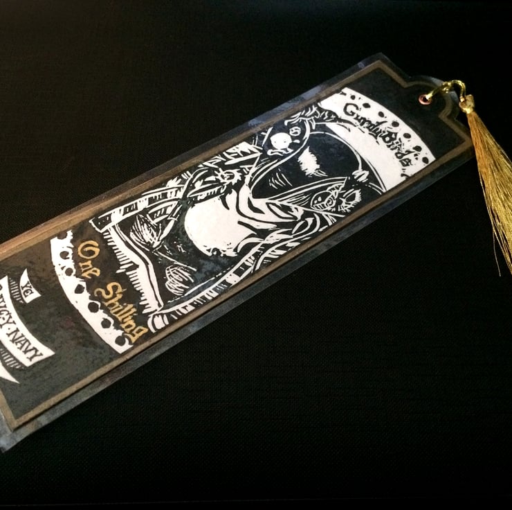 A repurposed linocut print of steampunk/georgianpunk pirate musician and my alter ego, GurdyBird, in waterbased black ink, with liquid metal gold acrylic paint and gold sharpie details, as well as handwritten text in fineliner, covered in book film, with a golden tassel attached at the top, with 2 hand sewn gold coloured sequins and beads to decorate. The back is card decorated with red fleur de lys decoupage paper.