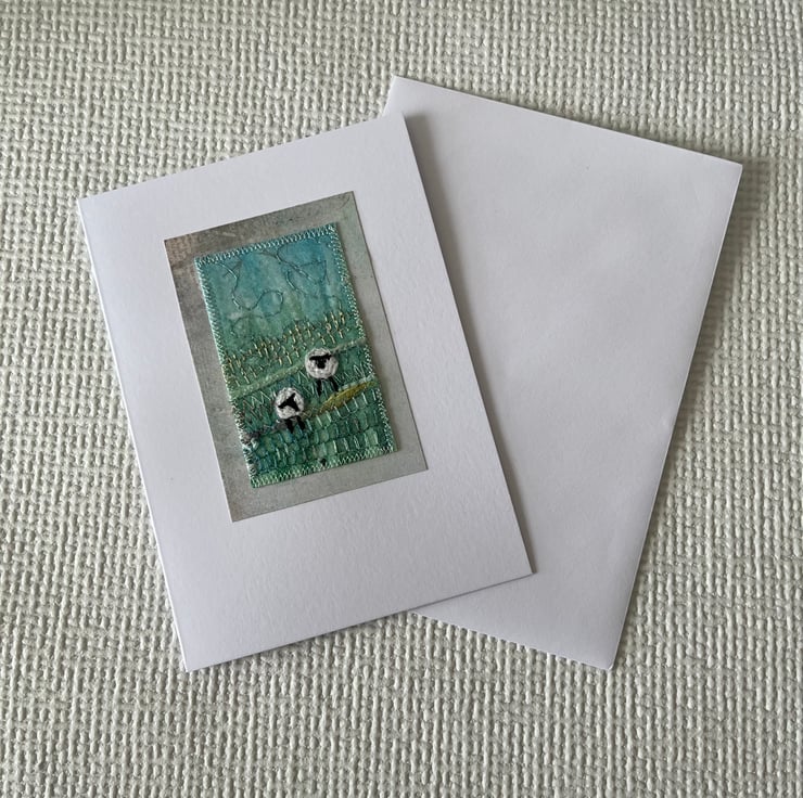 Featuring two happy gamboling sheep, this mixed media textile card is made using techniques including free motion machine embroidery and painting with inks.