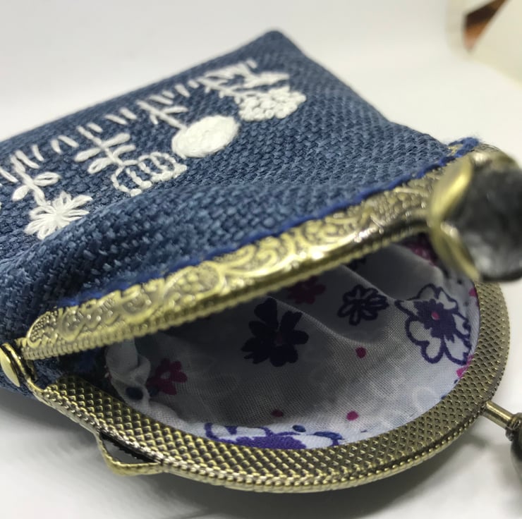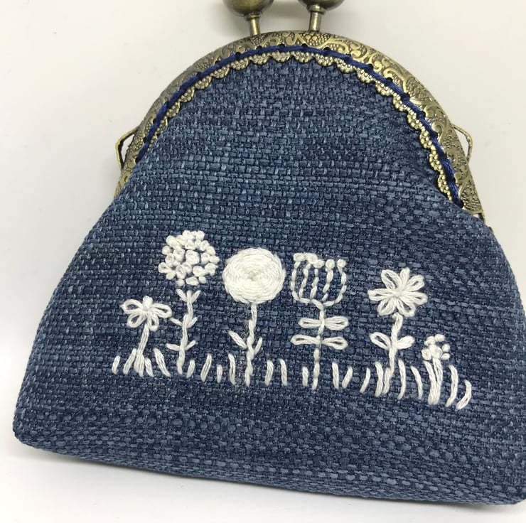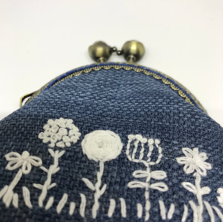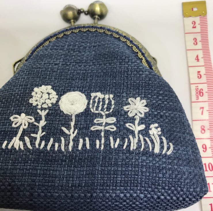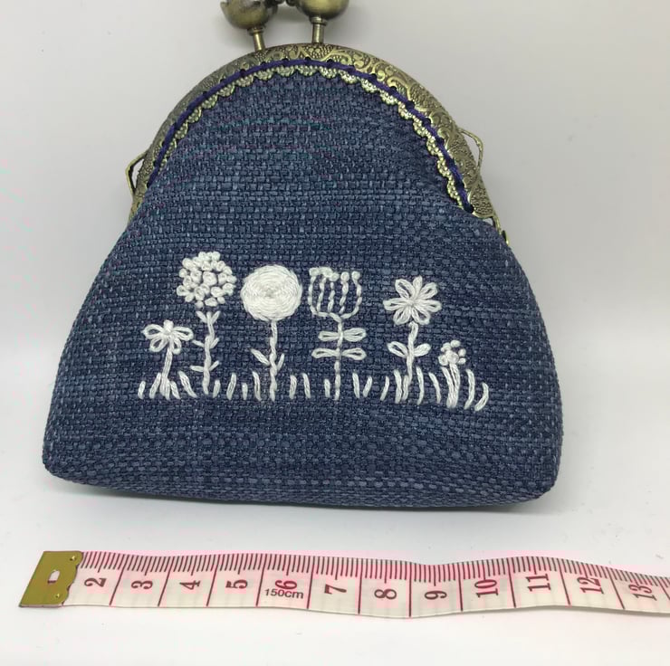 A cute , denim blue linen Clasp coin purse, embroidered with a row of white flower border. The back of this purse is plain.