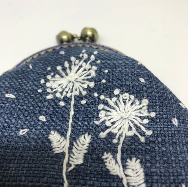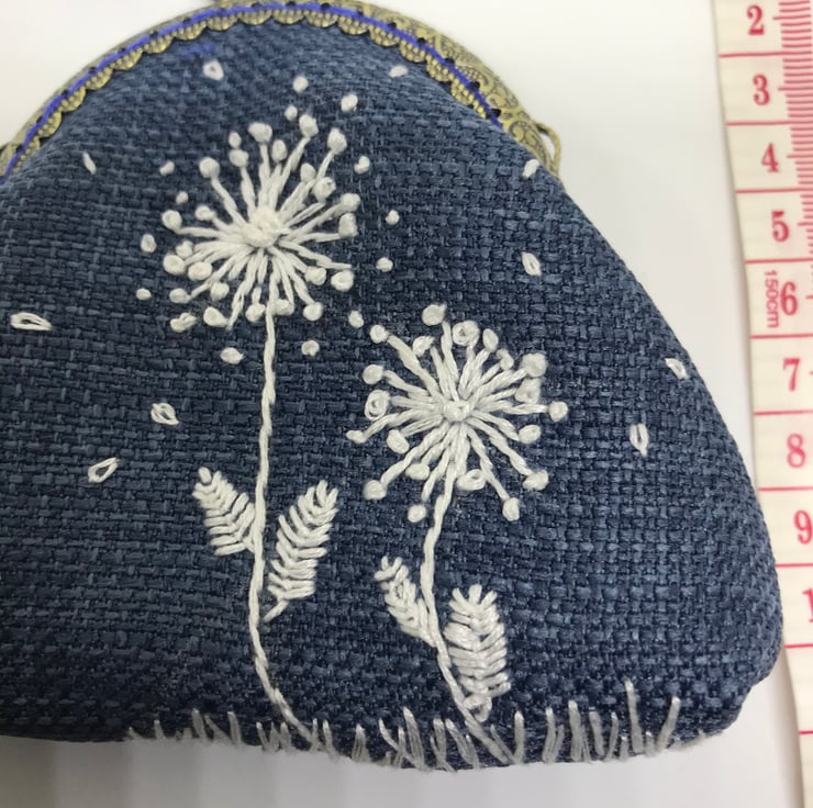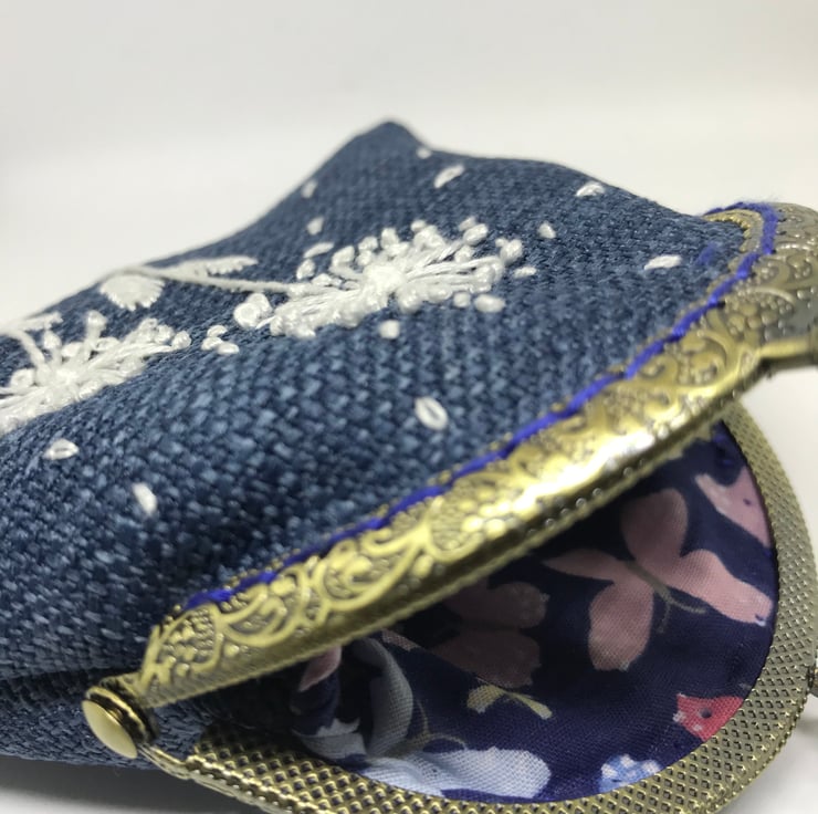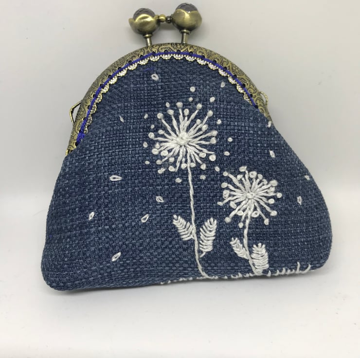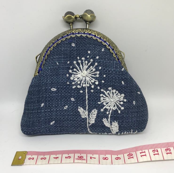 A cute , denim blue linen Clasp coin purse, embroidered with a row of white flower border. The back of this purse is plain.