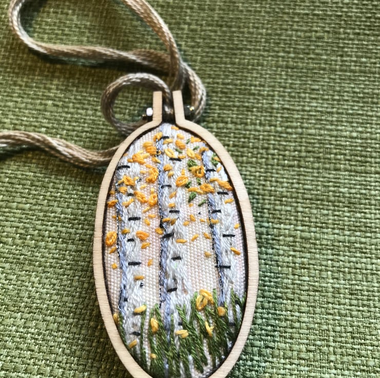 3 Silver Birch trees set in a cream Linen This is an hand embroidered piece onto cream linen fabric.The leaves are just turning yellow and falling onto the forest floor.