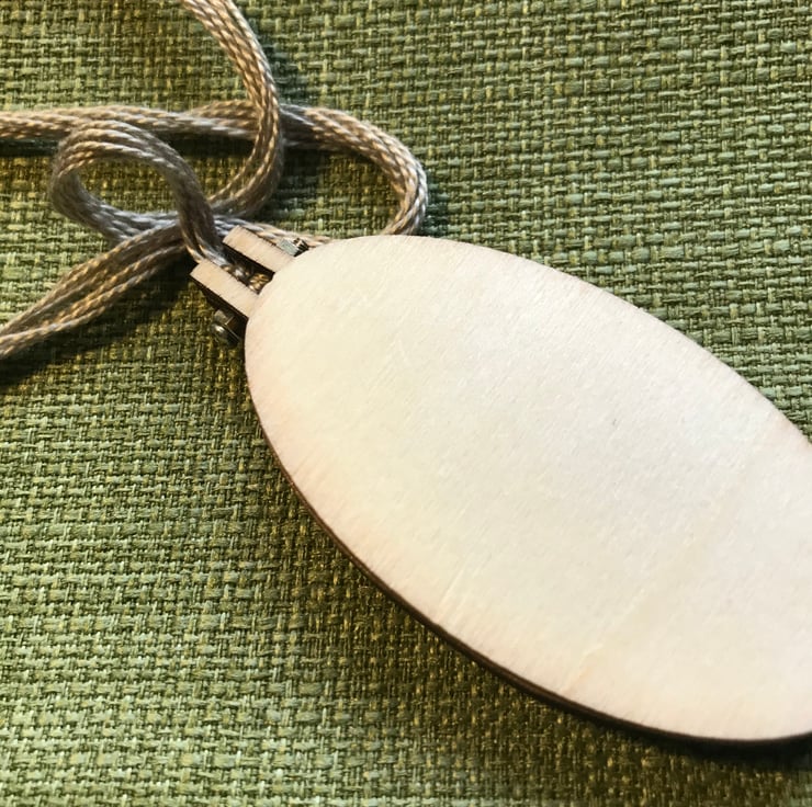 Size is 3.5 cm wide x 7cm long including the neck and is an oval wooden mini hoop necklace. The cord is made from a soft cotton silvery thread to match.