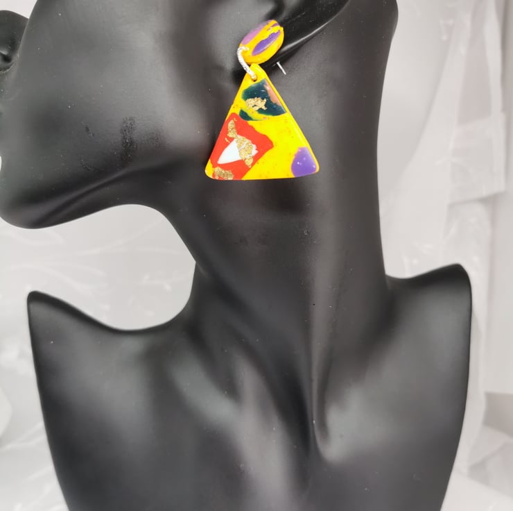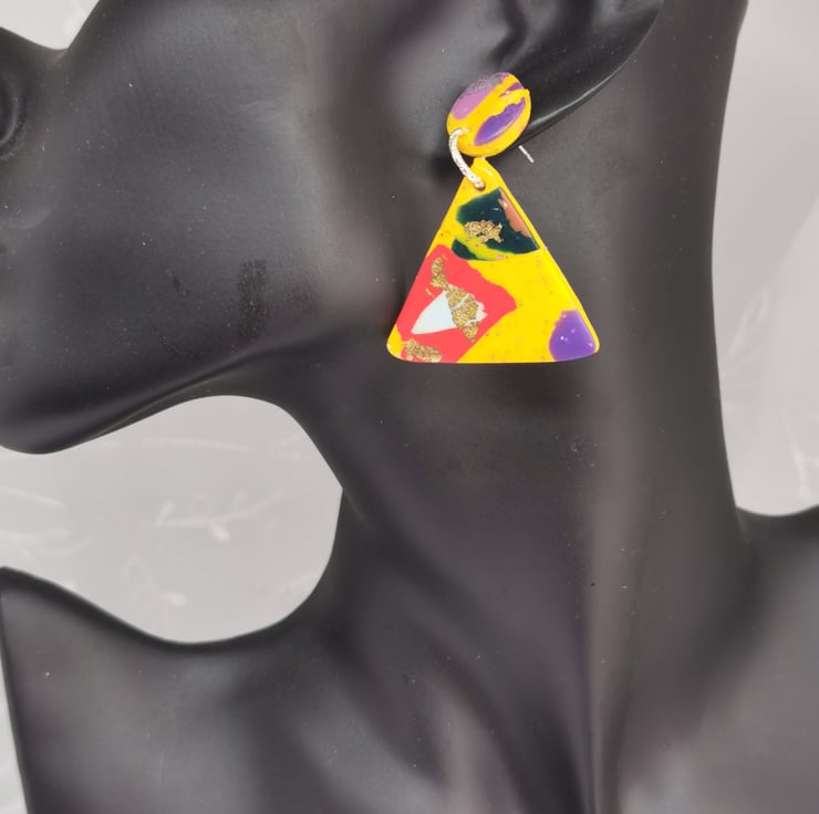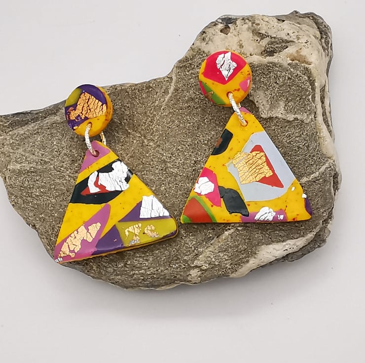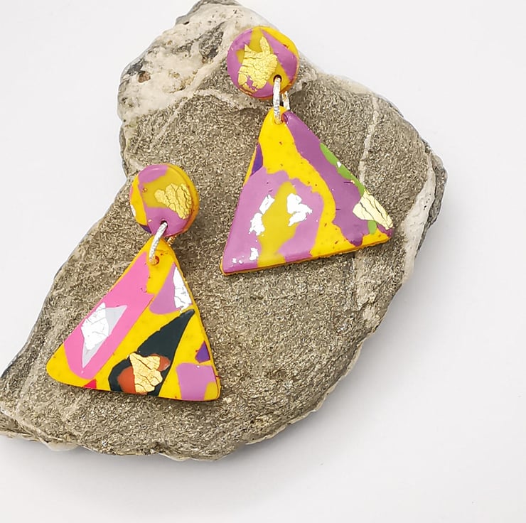 Triangular drop earrings with small round stud. Multicoloured Terrazzo pattern, with hints of copper, silver and gold leaf, on yellow glittered background.