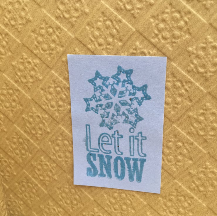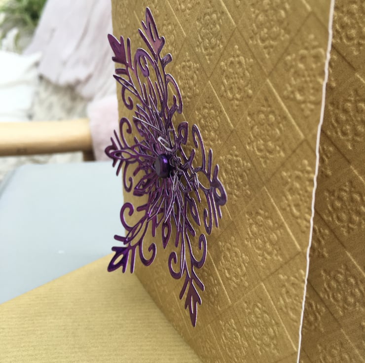 A lovely modern take on christmas. A 5x5 inch kraftcard embossed with a chequer board pattern if snowflakes. This is topped with a diecut multi-layered purple mirror card snowflake. This is held together with a matching metal purple brad. It comes with a matching envelope. Inside the greeting is Let it snow with a stamped snowflake in blue.
