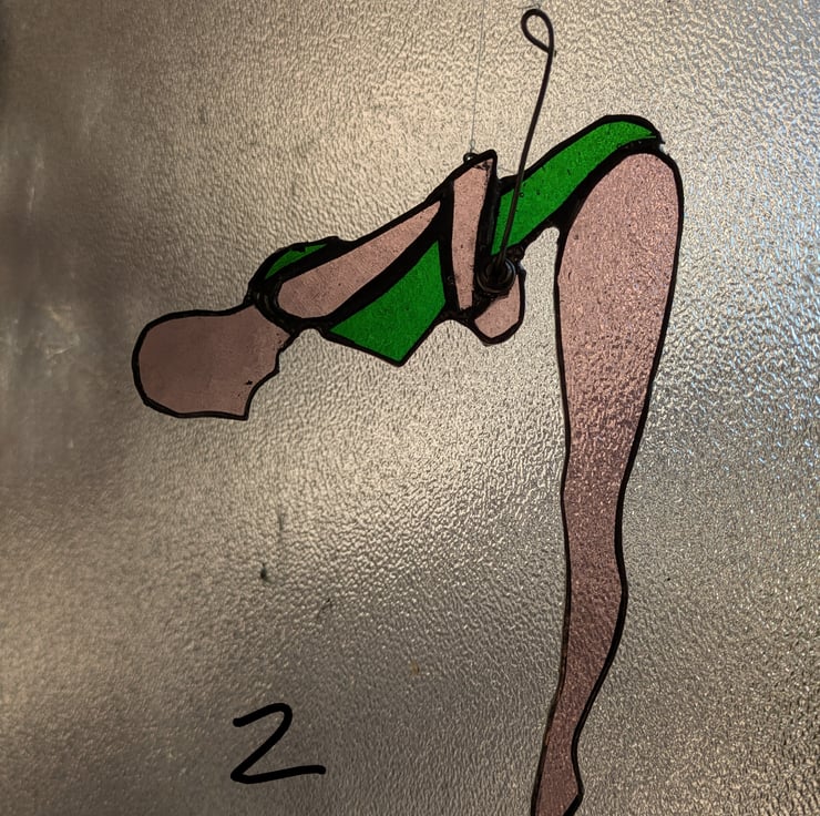 This colourful stained glass Circus Trapeze Artist makes a cheerful, playful suncatcher. It can hang on its own or it can be an accompanying piece to my stained Carousel Top and is made with the same circus colours. This Trapeze Artist has red arms and legs and a green suit but comes in other colours.. Her body size is approximately 15cm sq and she is made on axis so that she can spin- when ordering state the number you want shown on the photo of the item.