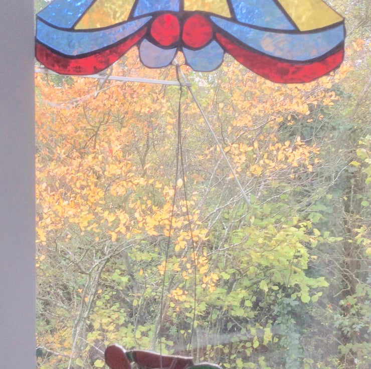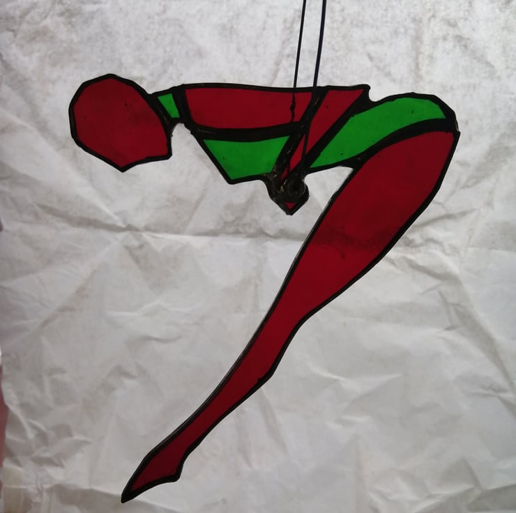 This colourful stained glass Circus Trapeze Artist makes a cheerful, playful suncatcher. It can hang on its own or it can be an accompanying piece to my stained Carousel Top and is made with the same circus colours. This Trapeze Artist has red arms and legs and a green suit but comes in other colours.. Her body size is approximately 15cm sq and she is made on axis so that she can spin-