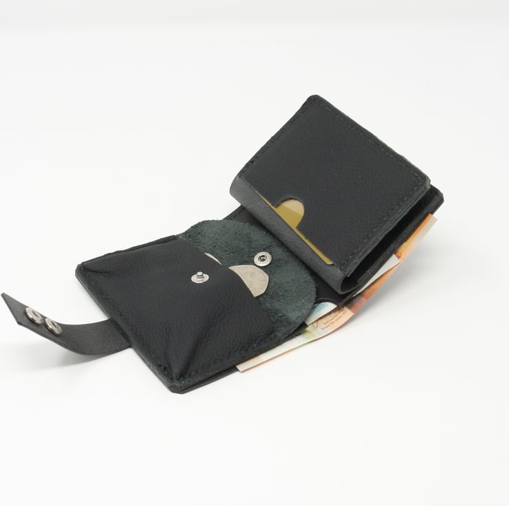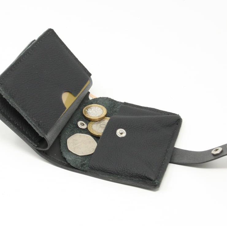 This smart black leather wallet has space for notes, cards and coins. The press stud closure has two settings - suitable for those occasions when you have amassed lots of receipts!