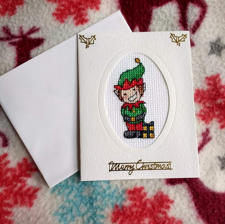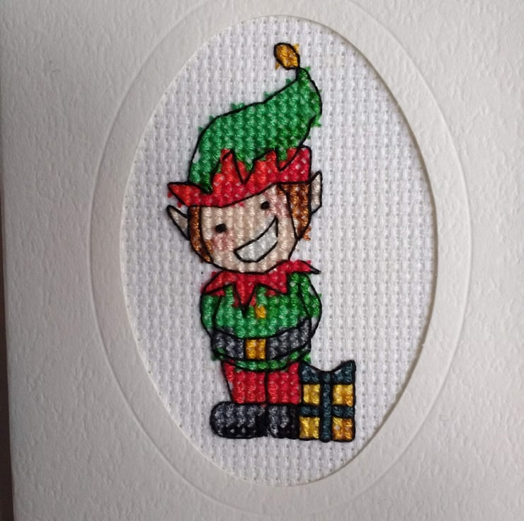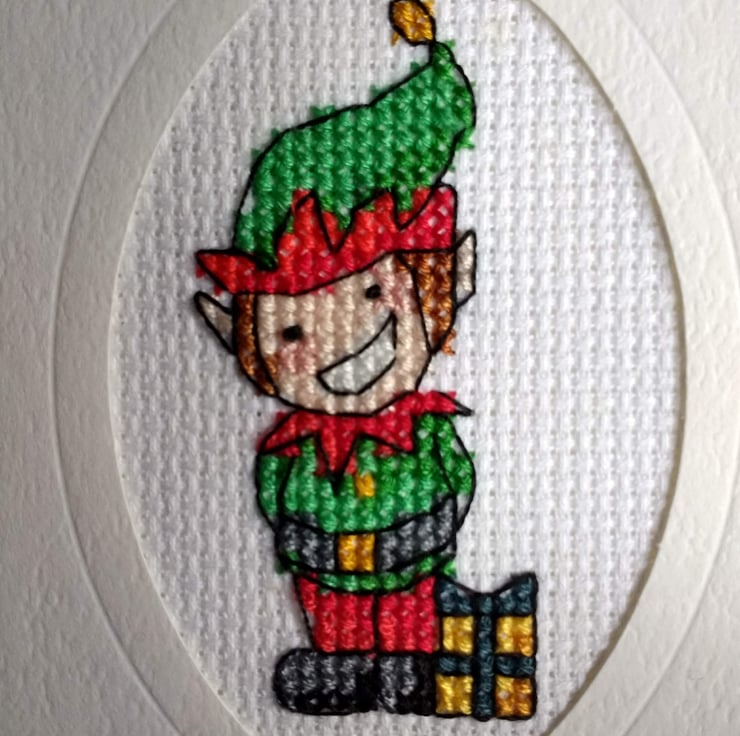 This delightful small Christmas card has a smiley, friendly, cheeky elf cross stitched onto aida and mounted into an oval aperture with gold peel off accents and greeting. The inside has been left blank for your message (card size approximately 11 3/4 x 9 1/4 cm) and comes with a matching envelope. Suitable for anyone who loves Christmas elves, it can be mounted after the festivities in a frame so he can come out and be displayed at future Christmases. Therefore he's a card and gift in one!