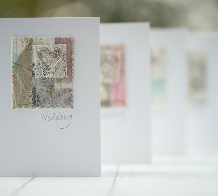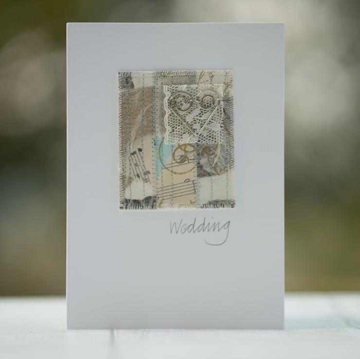 Using a variety of papers in pretty pastels, this pretty background was made to show off the metal heart, which has been mounted on a piece of vintage lace. Free motion machine embroidery adds extra detail. The word "wedding" finishes of the card perfectly.