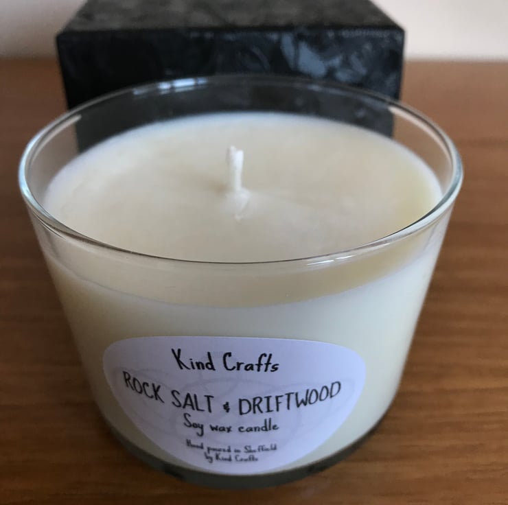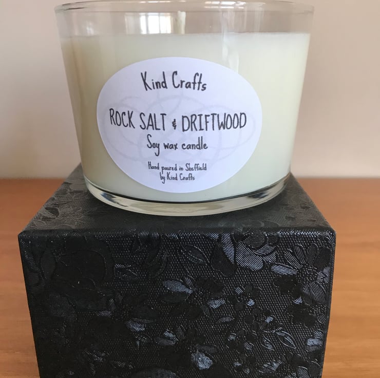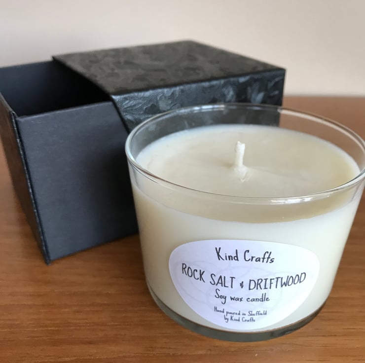 Soy wax candle, Rock Salt and Driftwood vegan friendly in a gift box. .