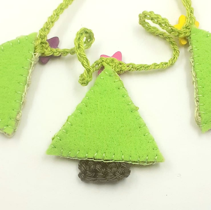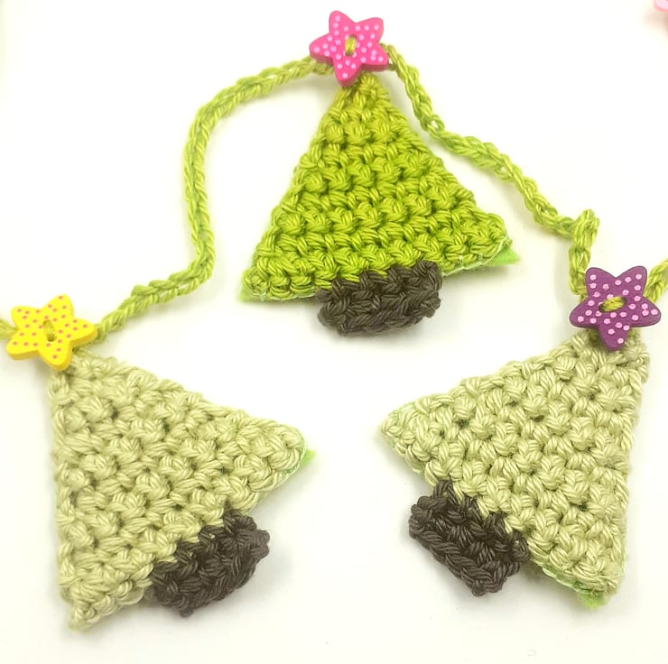 This festive garland is crocheted in cotton. The trees are in alternate light and bright shades of green and each is topped with a painted wooden star button. The trees are backed with stiffened felt for stability. The whole garland measures approximately 155 cm long and is finished at each end with a painted wooden bead.