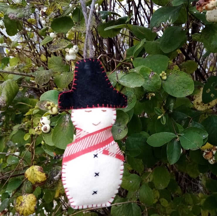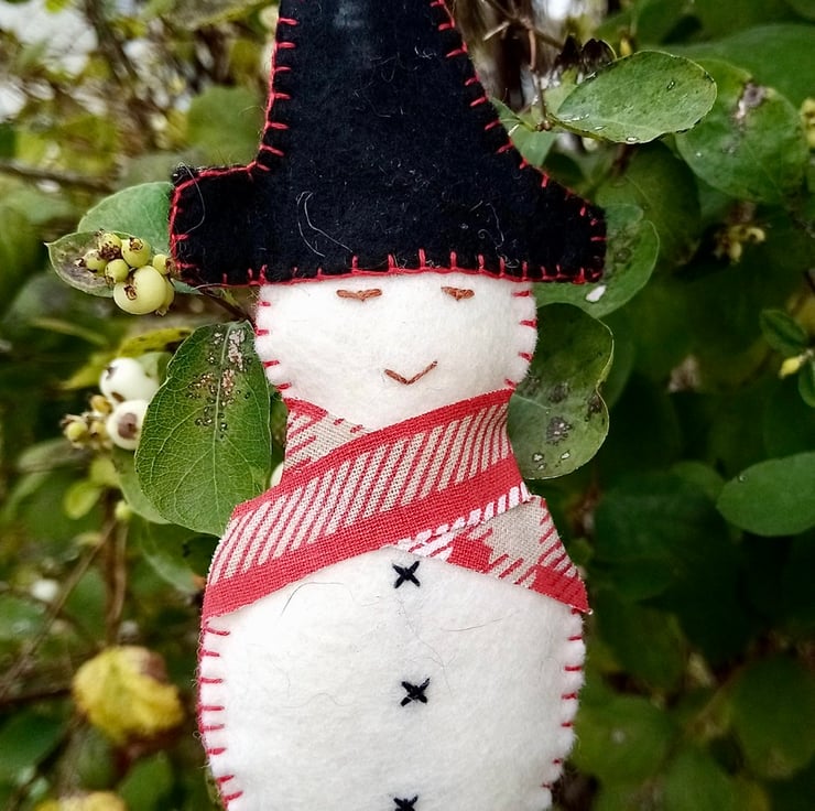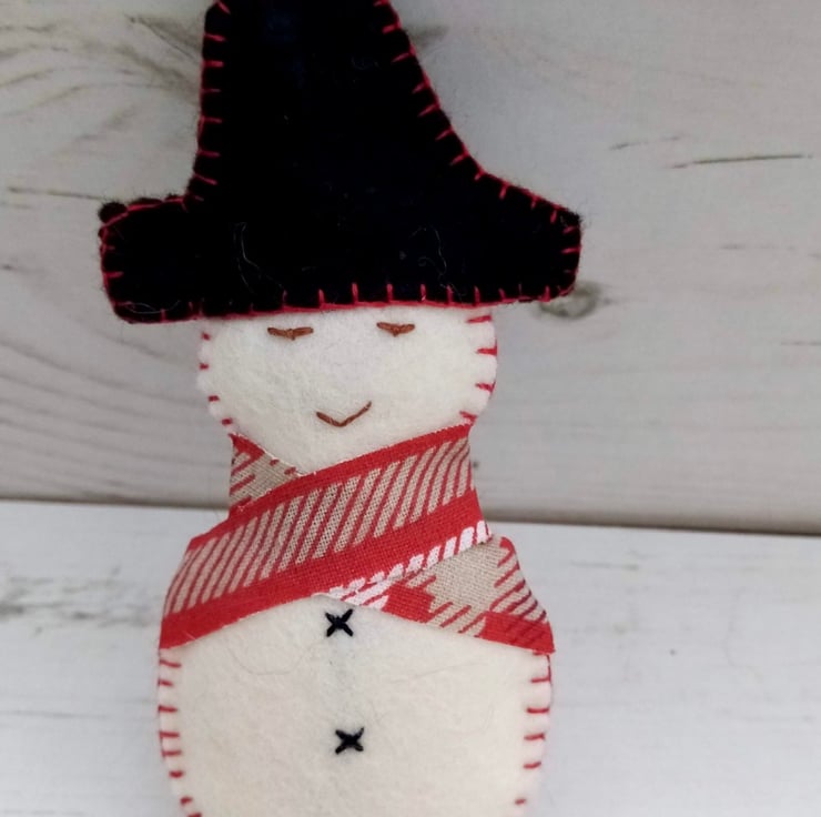 Snowman tree decoration, made with felt and hand embroidered, complete with black top hat and tartan scarf. Approx 12 cm tall. Free delivery.