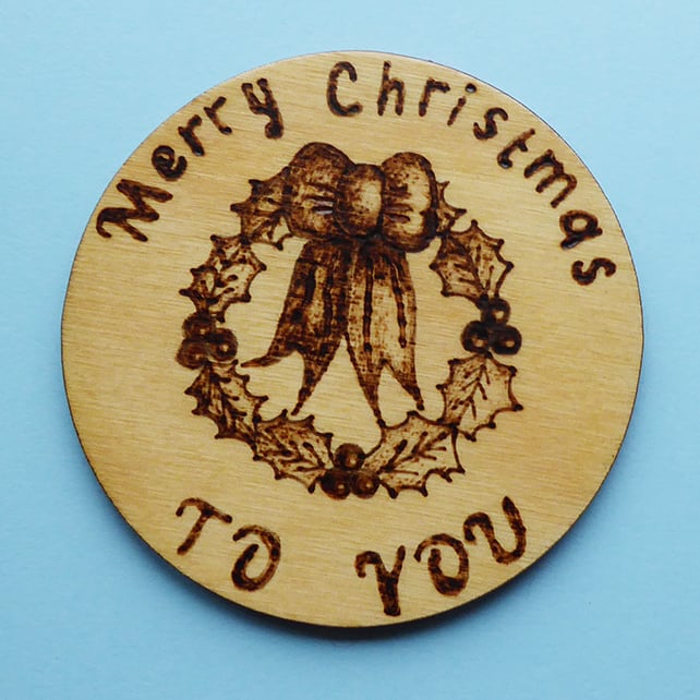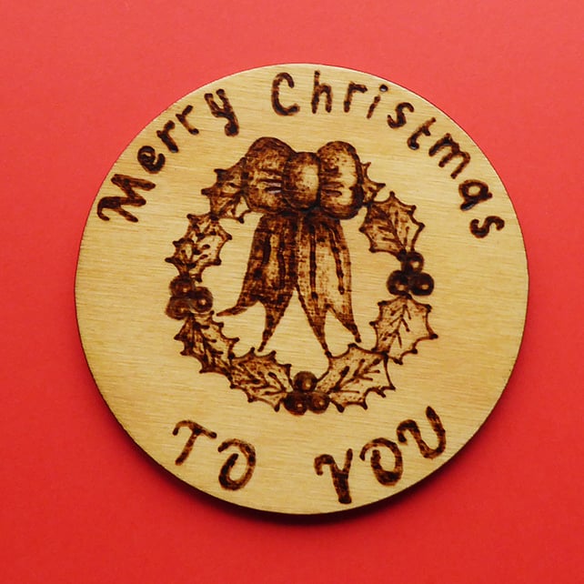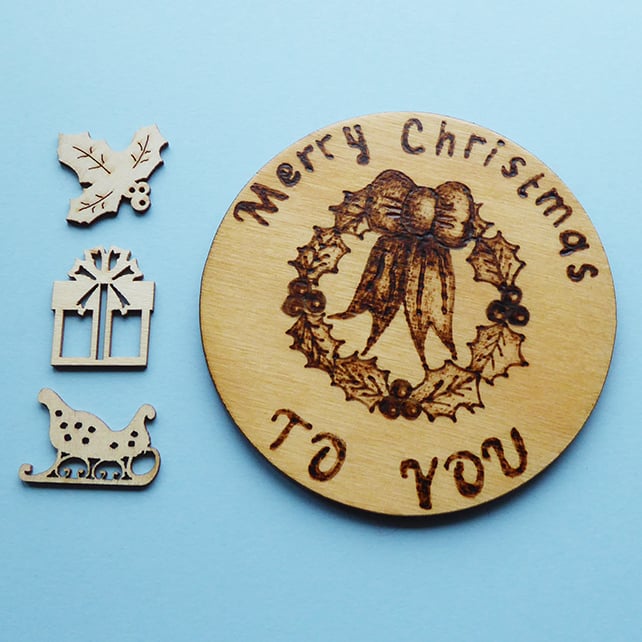 It features a Pyrographed wreath design with the words ‘Merry Christmas to you’ around the edge.