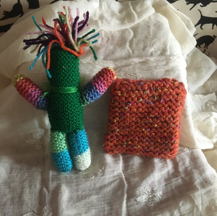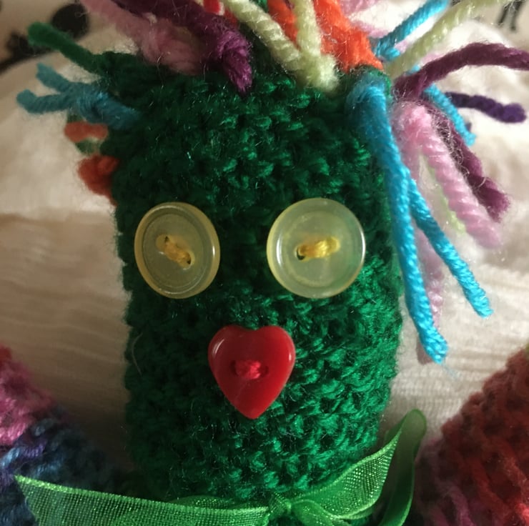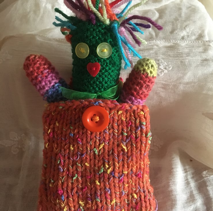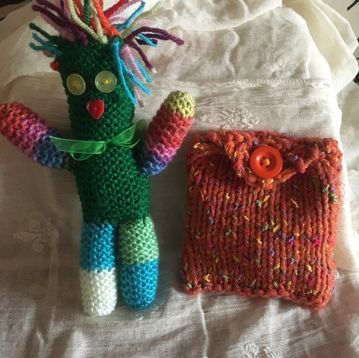 The knitted purse is a nice place for him to rest or to keep bits and pieces.