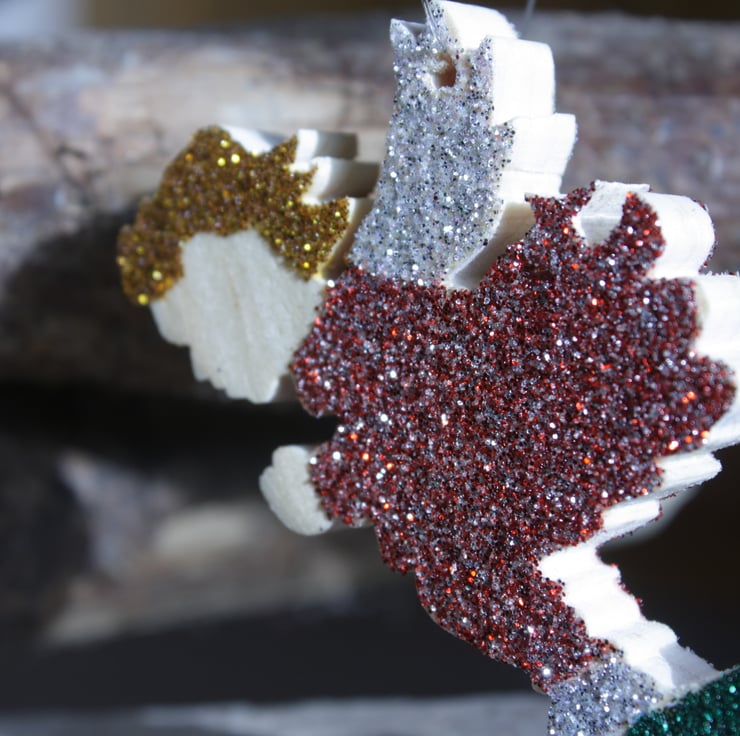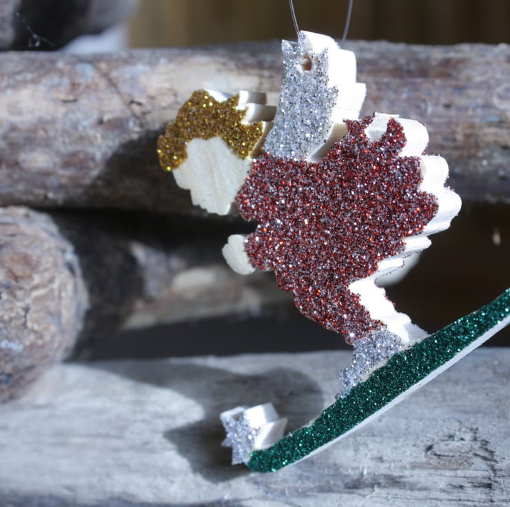 A piece of recycled wood was cleaned and sanded to enable me to upcycle it. The design was applied to the wood and cut using a Scroll Saw. Glue was then added to the decoration and glitter was applied.