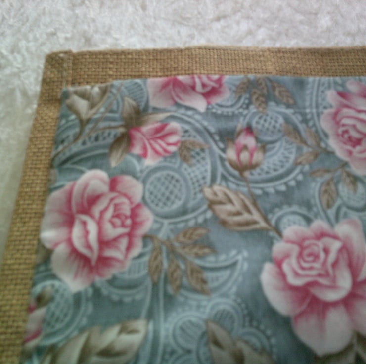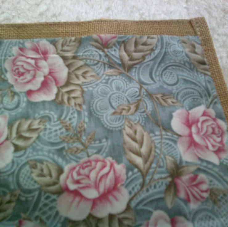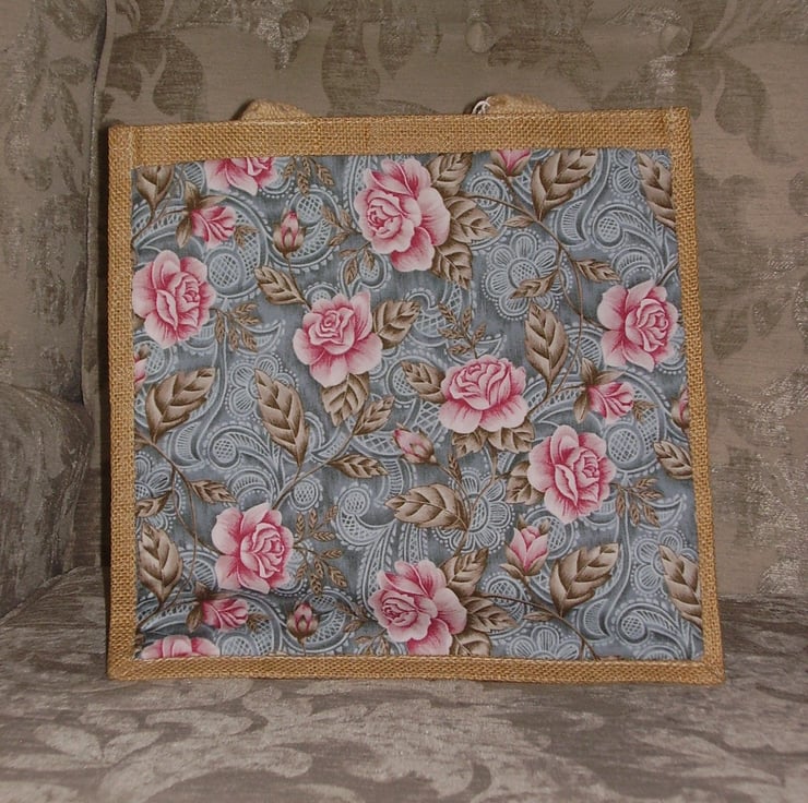 This Jute bag comes with padded handles and a handy fabric pocket with a design of Pink Roses on a grey background . The bag measures approximately 30 x 30 x 20 cm (12 x 12 x 8 inches). It will make an ideal gift bag that can be used as a shopping bag afterwards.