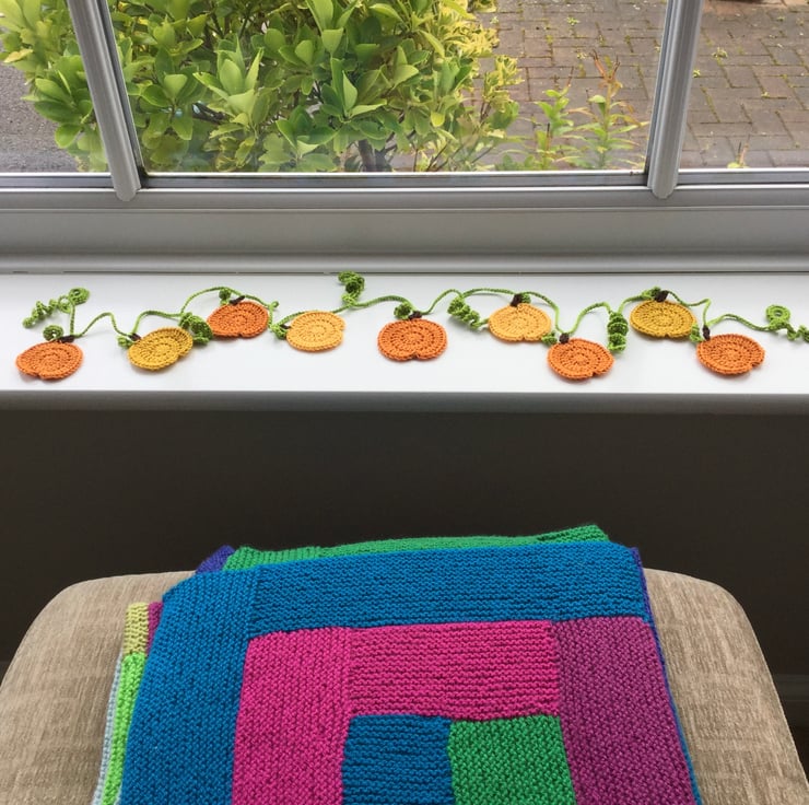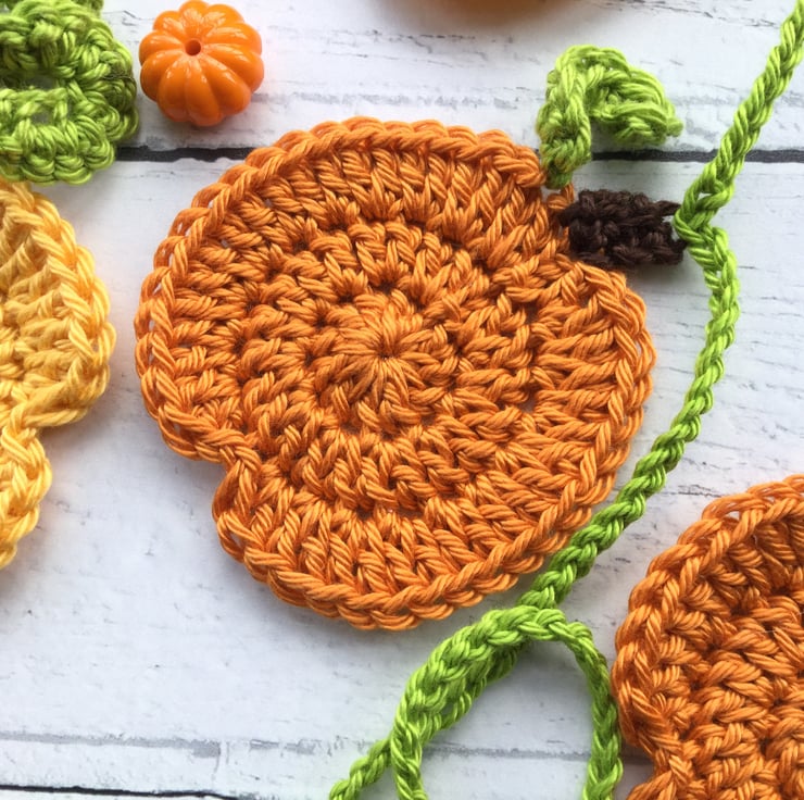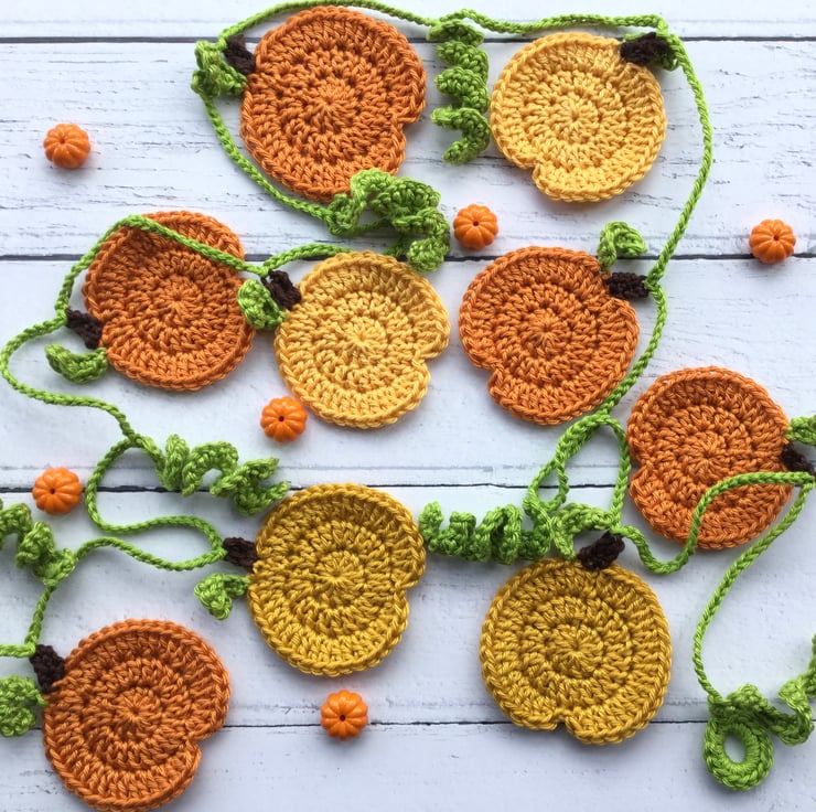 I have crocheted this pumpkin garland using a 100% cotton yarn in orange, 2 shades of golden yellow and green.
