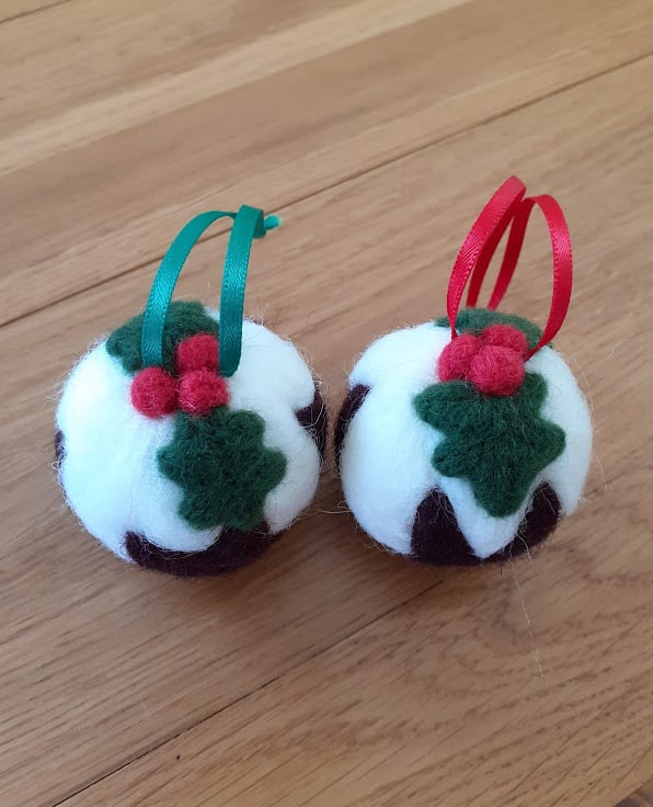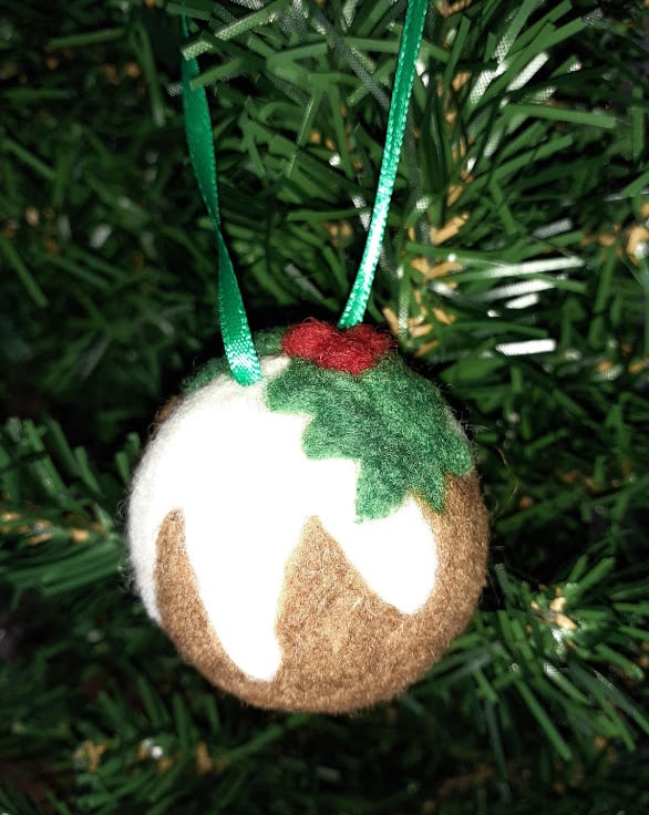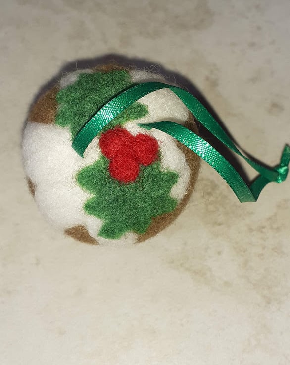 A hand made needle felted Christmas pudding bauble. Round brown pudding complete with cream and holly decoration. Approx. diameter 4.5 cm. Ribbon hanging sewn on.