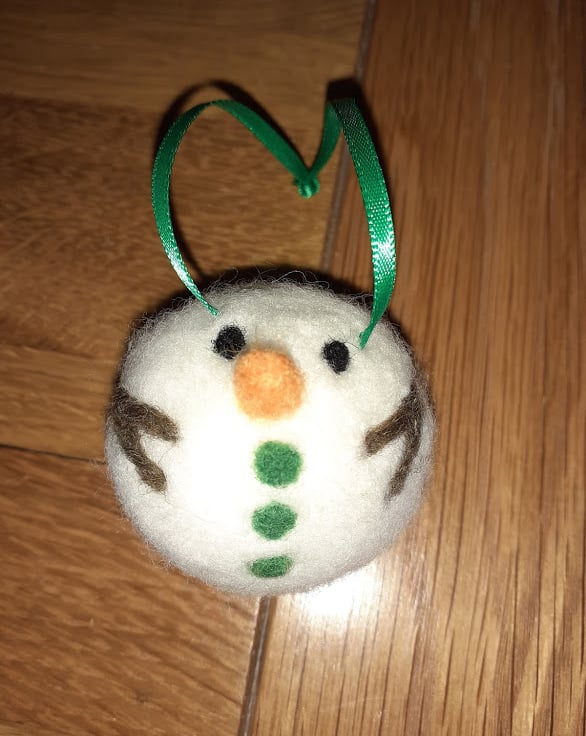 Hand made needle felted snowman bauble. White with brown branch arms, green buttons, a carrot coloured nose and black eyes. Cute design. Approx 4.5 cm diameter. Ribbon hanging sewn on.
