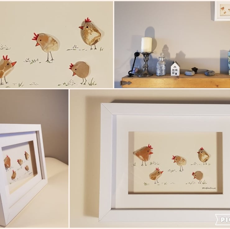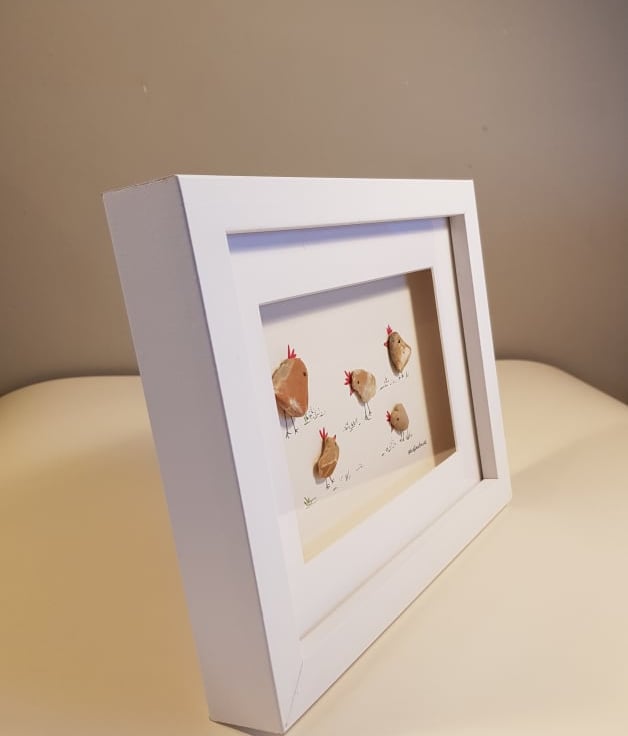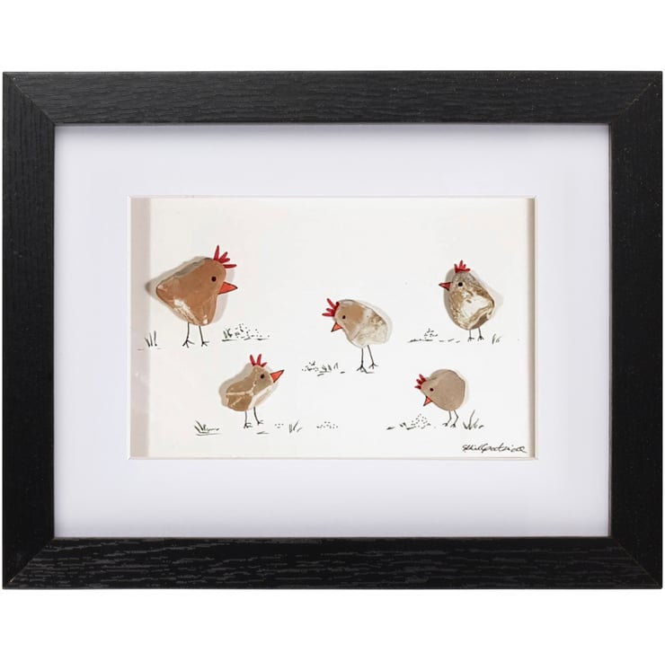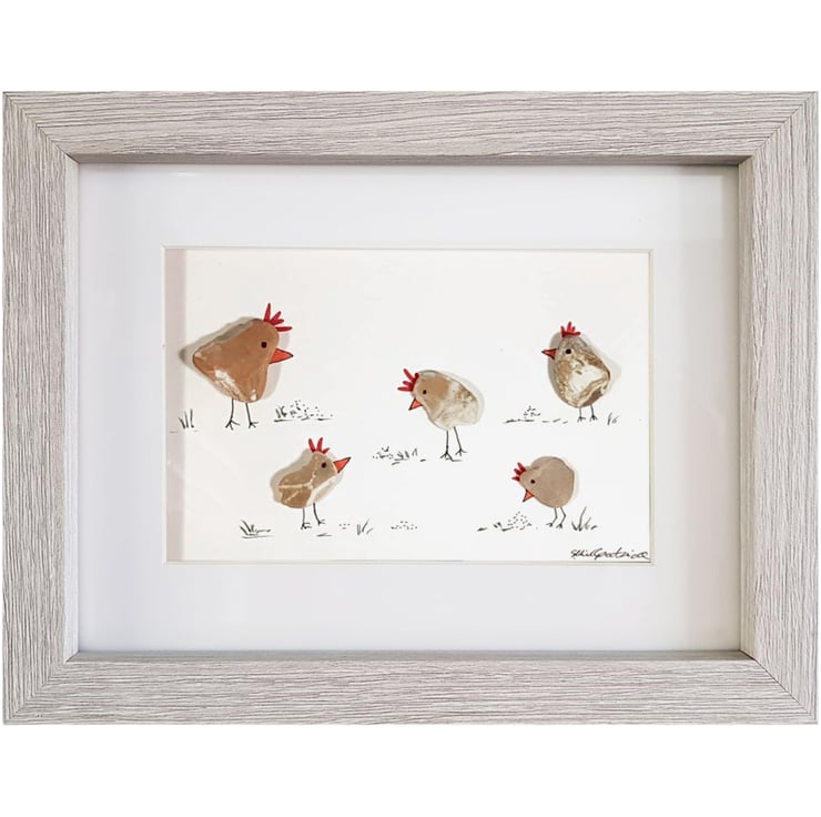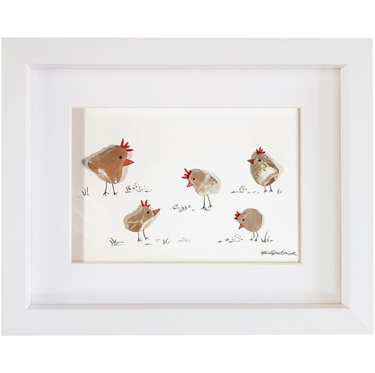Golden Chickens - Pebble Picture - Framed Unique Handmade Art