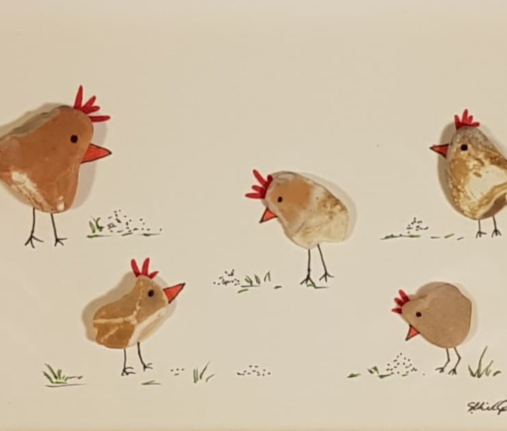 Golden Chickens is a unique pebble art creation by me, Sophie Kirkpatrick.
