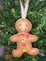 Made from felt, this handsewn gingerbread man is always popular. Brown gingerbread with red and green button decoration, and a ribbon bow at the neck. Approx. size, 10cm high, 8cm wide. Each one individually made, therefore decoration may vary slightly.