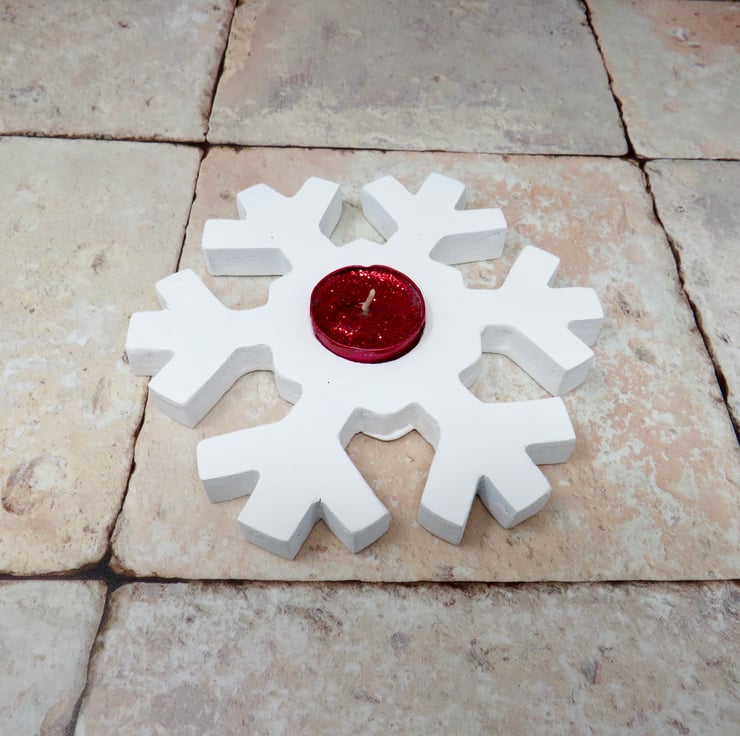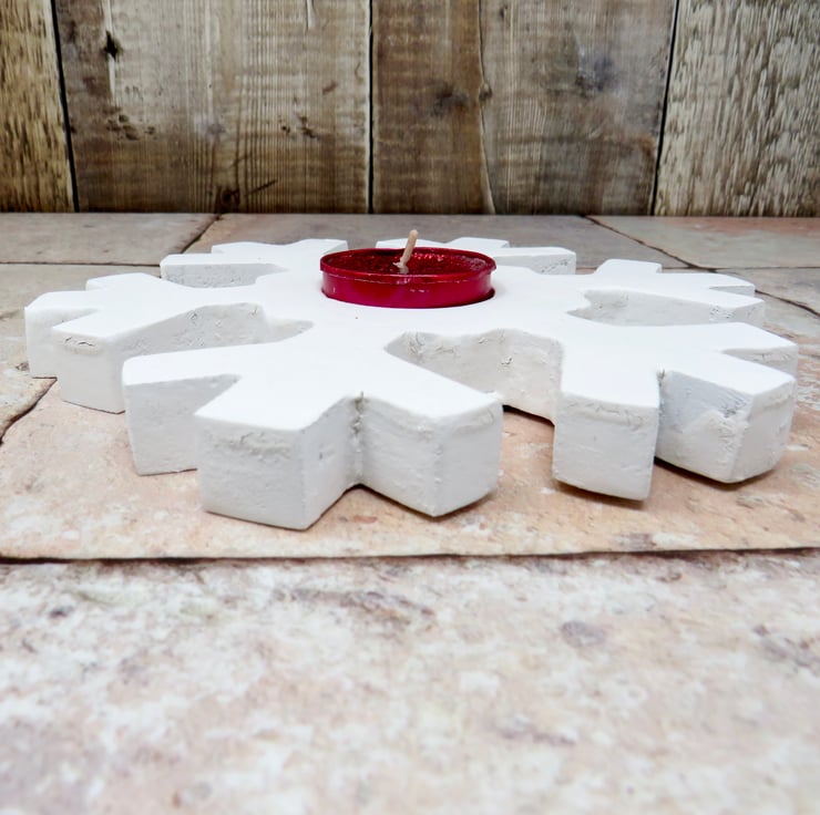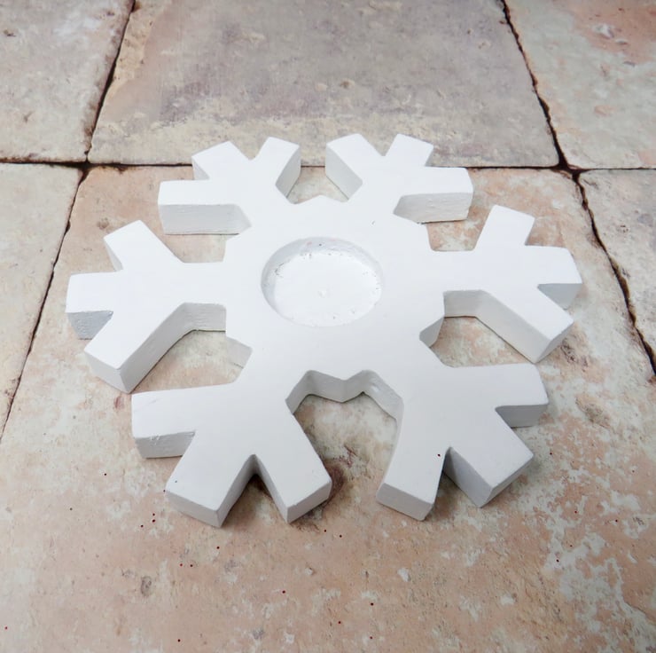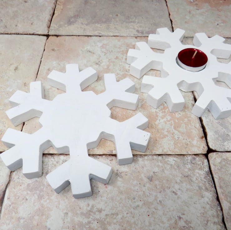 Pair of wooden snowflake tea light holders made from pallet wood and painted with white chalk paint. Sealed with matt finish varnish they would look great on any mantle or table at Christmas.