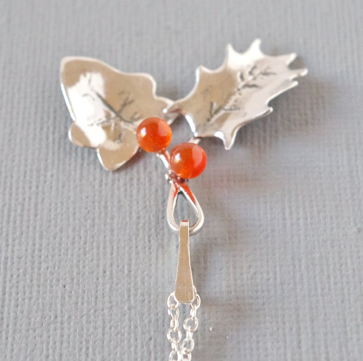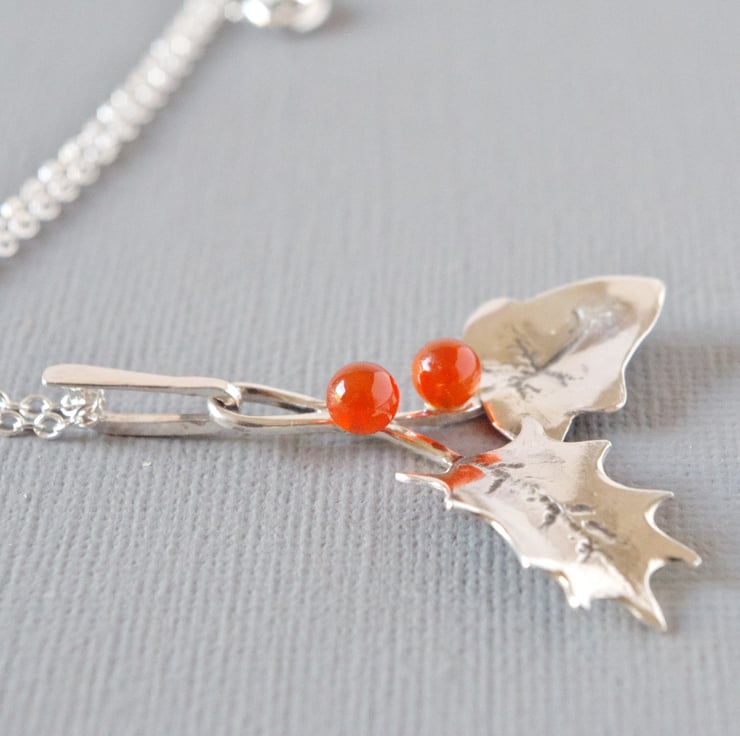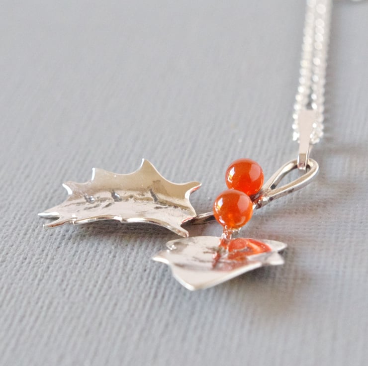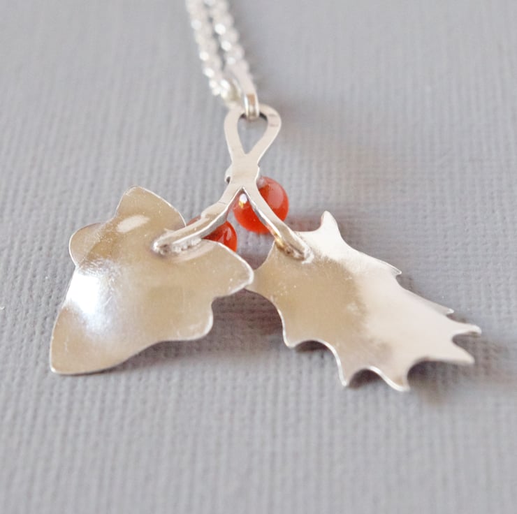 In celebration of Christmas, or is that Yule? I have made this naturalistic, triangular, Sterling Silver pendant inspired by the traditional Christmas song, "The Holly and The Ivy," with hand carved and engraved holly and ivy leaves enhanced by a little light antiquing and brilliant red carnelian "berries." These are natural stones which are found in the North African desert, turned a vibrant warm red by the action of UV light from the sun. Each leaf has been shaped from thick silver sheet using a jeweller's saw and given it's own special character by anticlastic raising (a pringle shape) in the case of the holly leaf, and repousse in the case of the ivy leaf. I have then engraved the leaf veins freehand and bezeled the edges before antiquing and polishing the leaves to a mirror shine. The stems are forged by hand from sterling silver wire, with mounts for the semi-precious carnelian beads. This pendant measures 40 mm by 40 mm at its longest and widest points and is sold on a sturdy 450 mm sterling silver chain fastened with a bolt ring clasp.