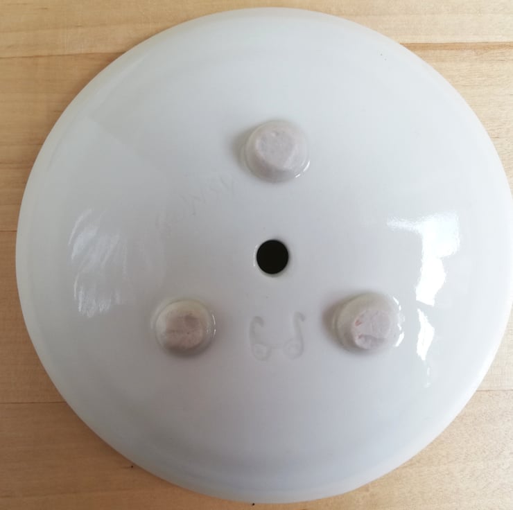 Hand thrown off the hump on my potter's wheel and altered to make cut out hole for drainage and little feet so no more soggy soap. Once bisque fired and hand painted lead free glaze was applied prior to the second firing.