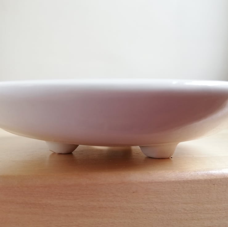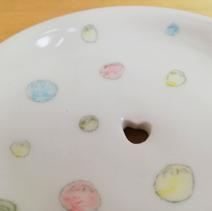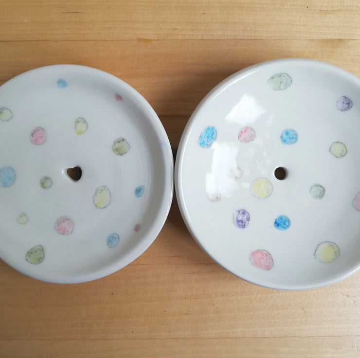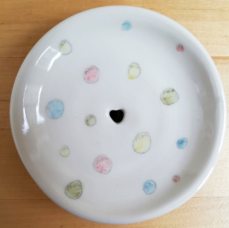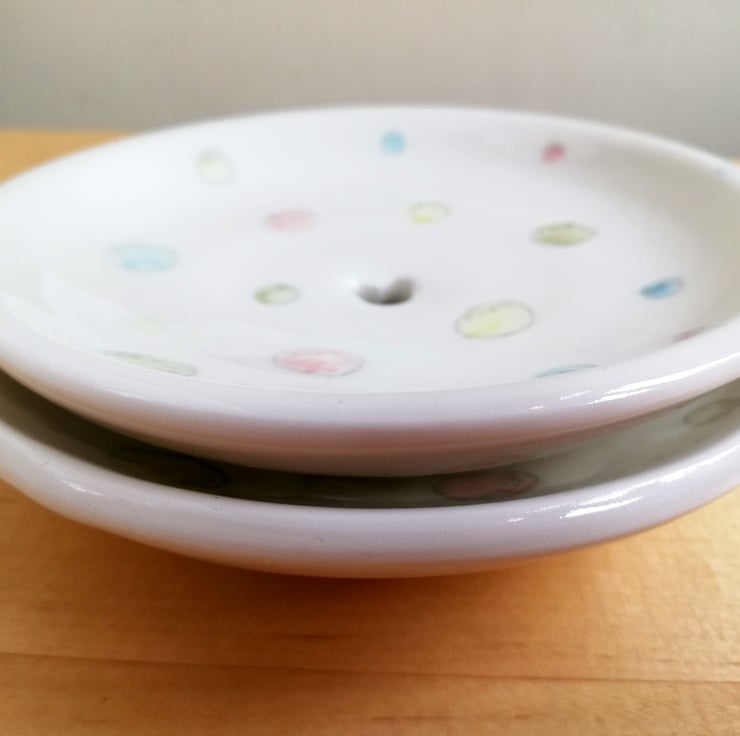 Hand made ceramic soap holder with handpainted pastel bubbles with dot drainage on white stone ware clay with little feet. (Dish with heart drainage is out of stock).