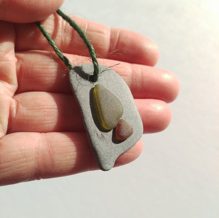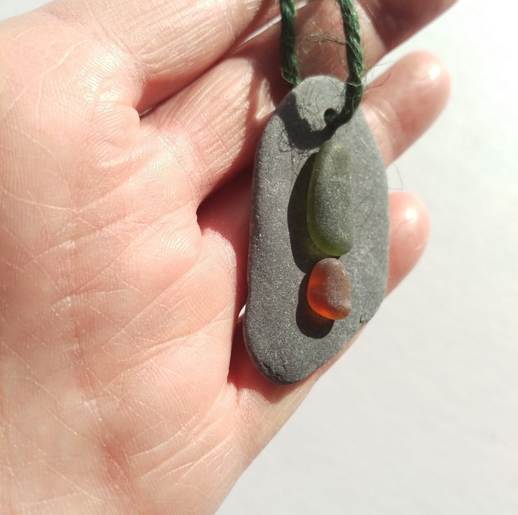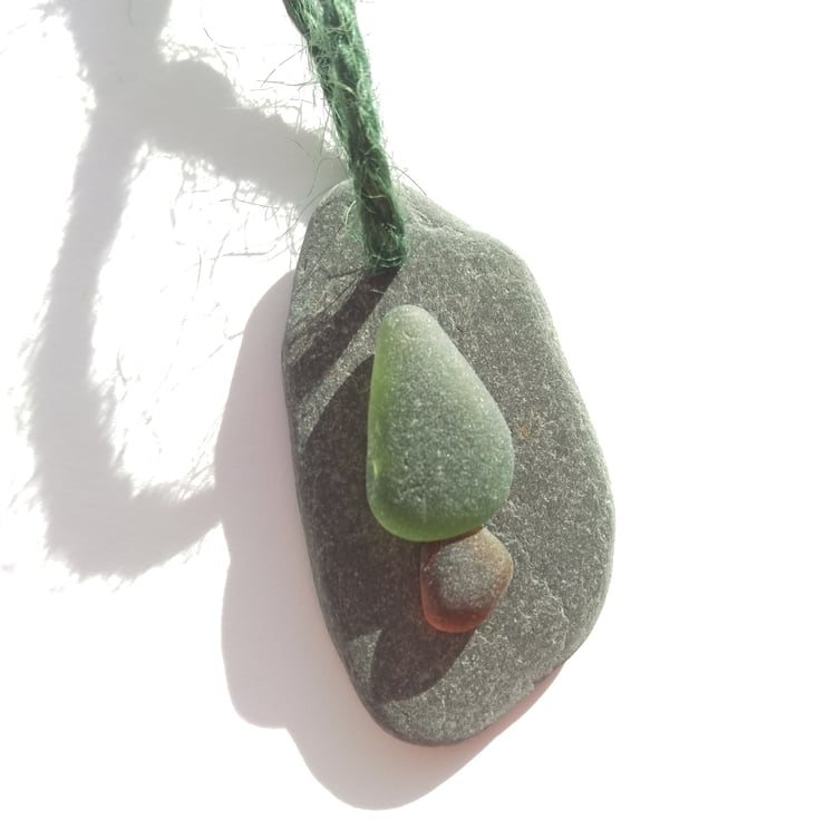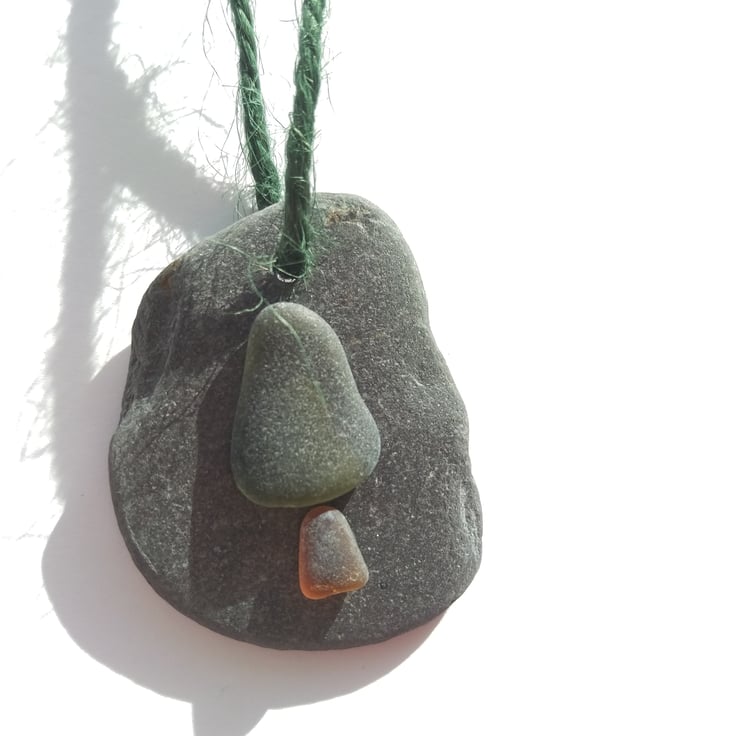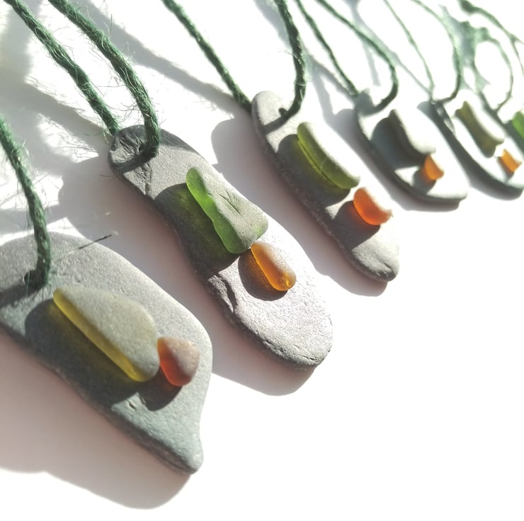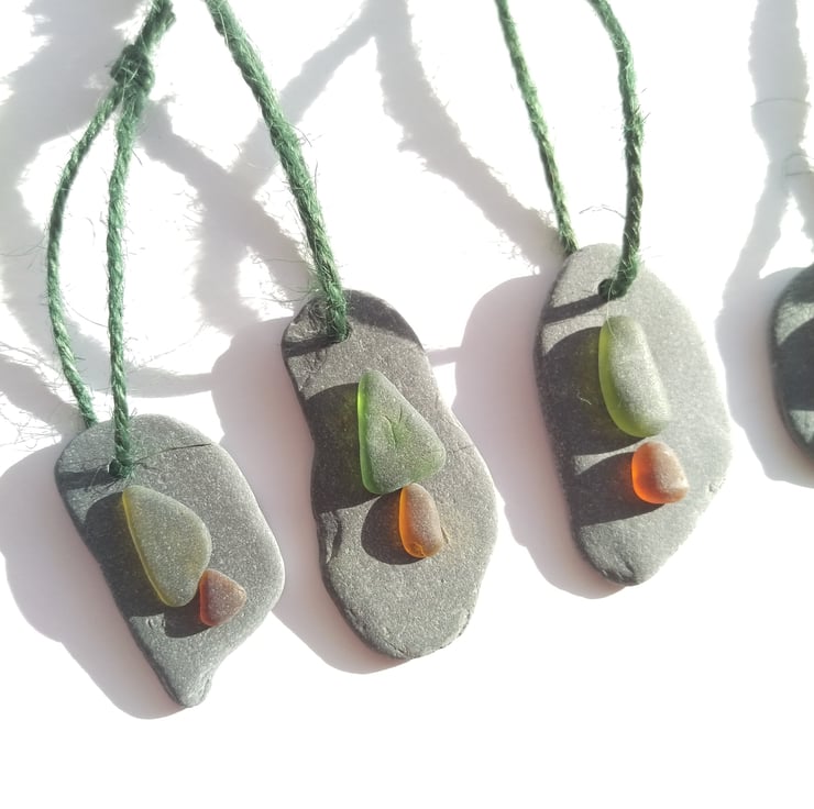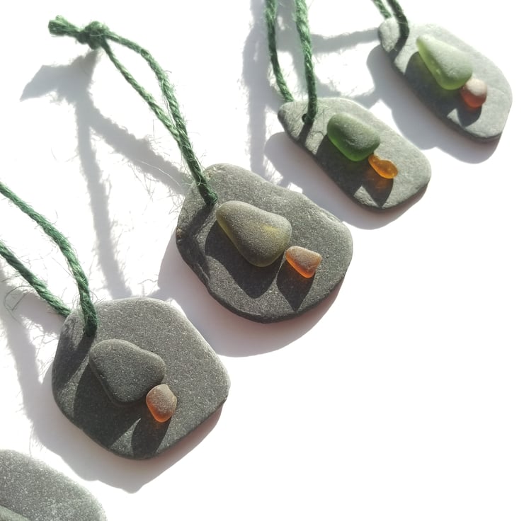 These decorations have been made from sea glass and slate that I've collected from the beaches around my home on the Isle of Wight.