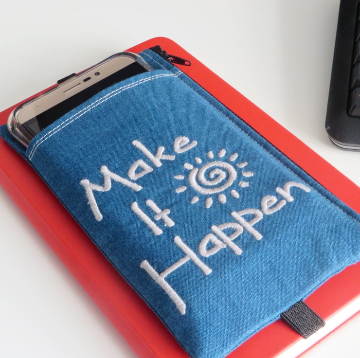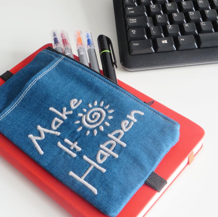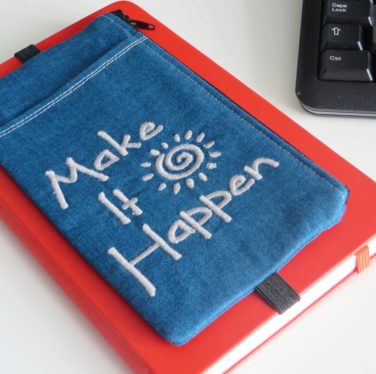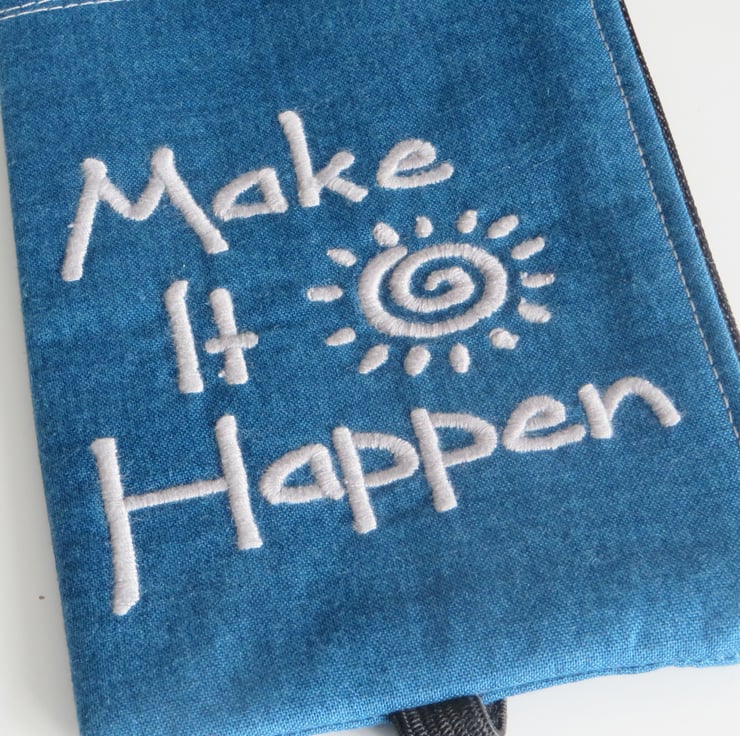 This zipped pouch made from cotton fabric is the perfect addition to your bullet journal or planner. On the front pocket the phrase 'Make it Happen' is machine embroidered as an inspirational quote.