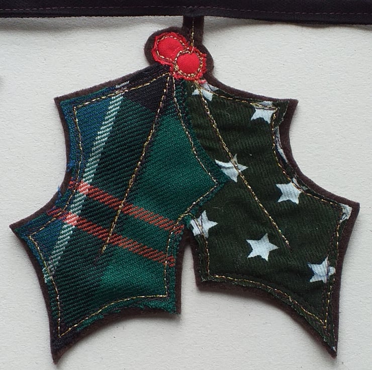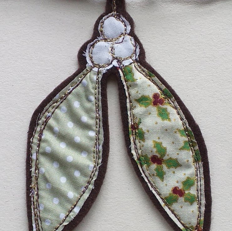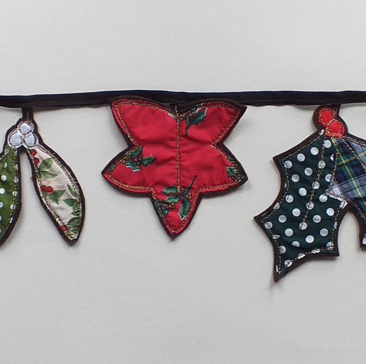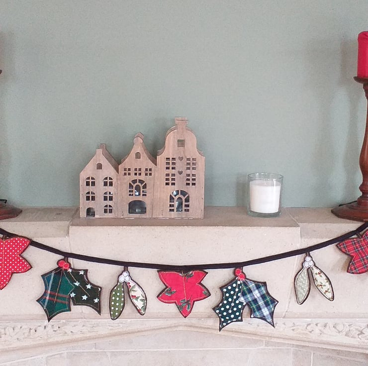 This beautiful Christmas garland is made from fabric backed with felt and overlaid with freestyle machine embroidery in gold thread. It is perfect for hanging from a mantelpiece or above a window or door to make your home feel festive.