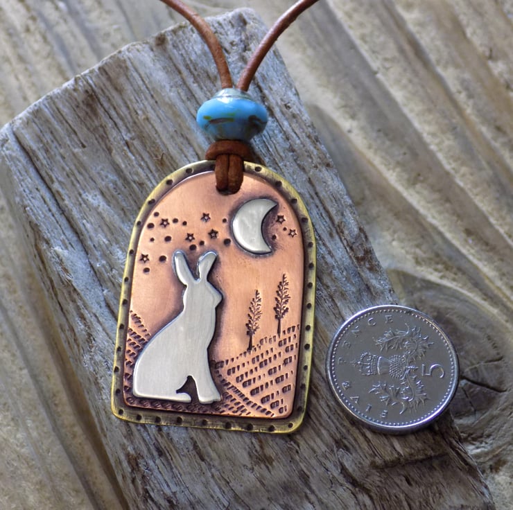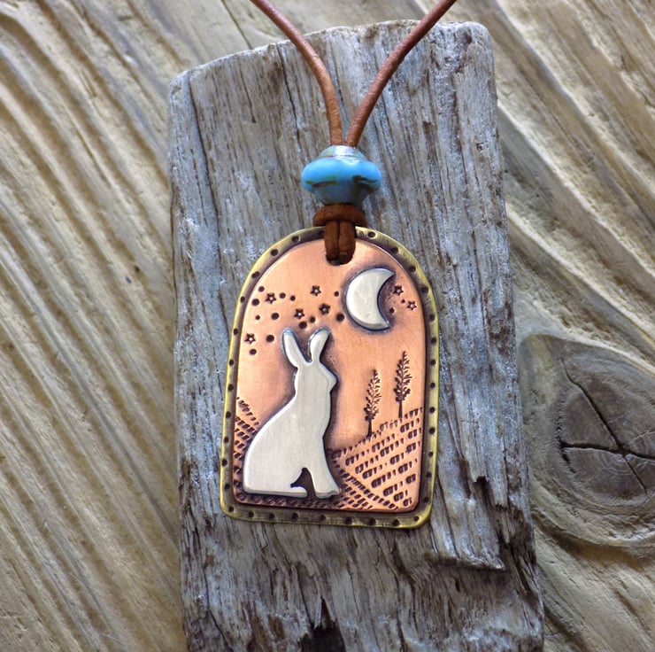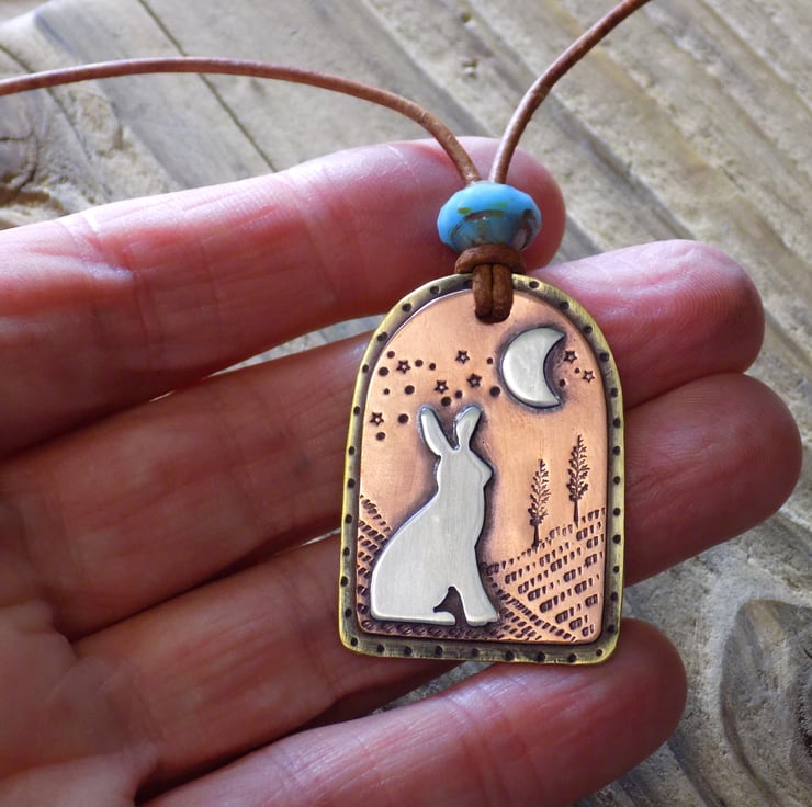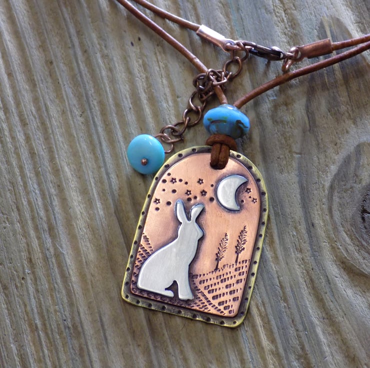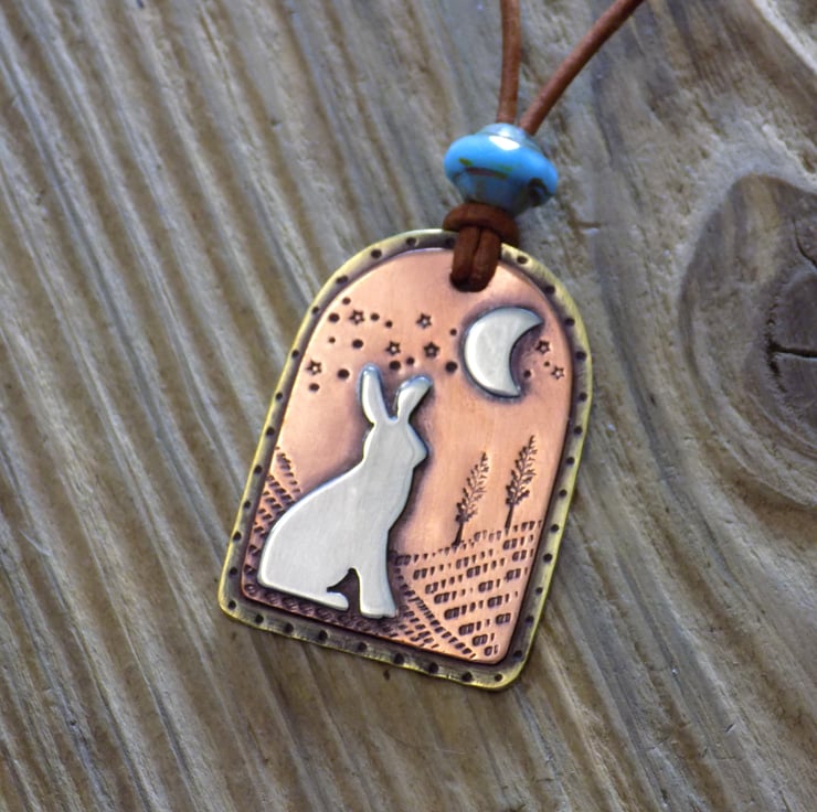 Made from layers of soldered copper and brass with a silver hare and moon carefully soldered to the front. Textured with metal punches to create an autumnal back drop and a little milky way galaxy dancing across the moonlit sky. Simply threaded onto vintage leather cord with the addition of a drilled out Czech bead. Adjustable from 18-20" .