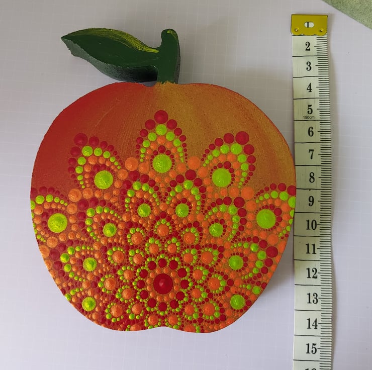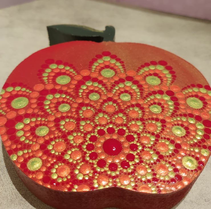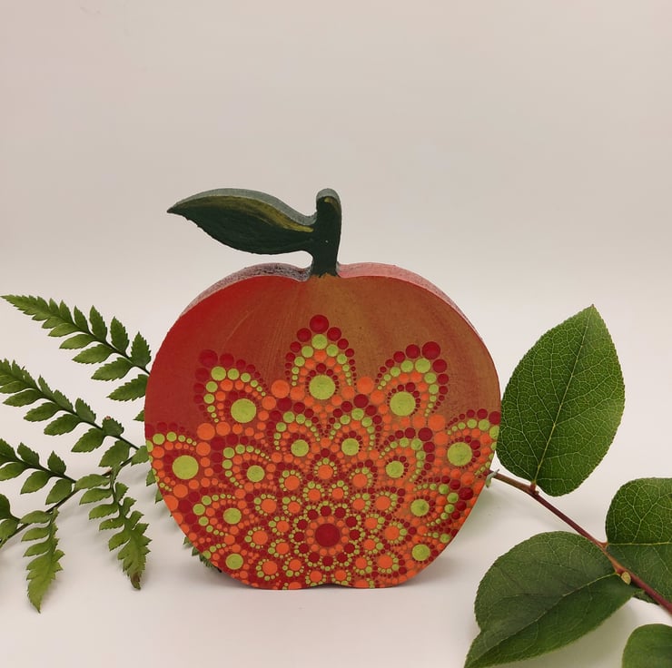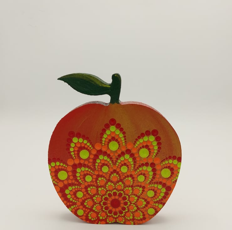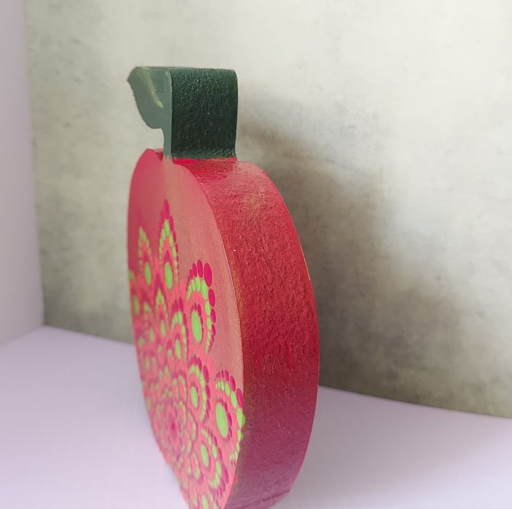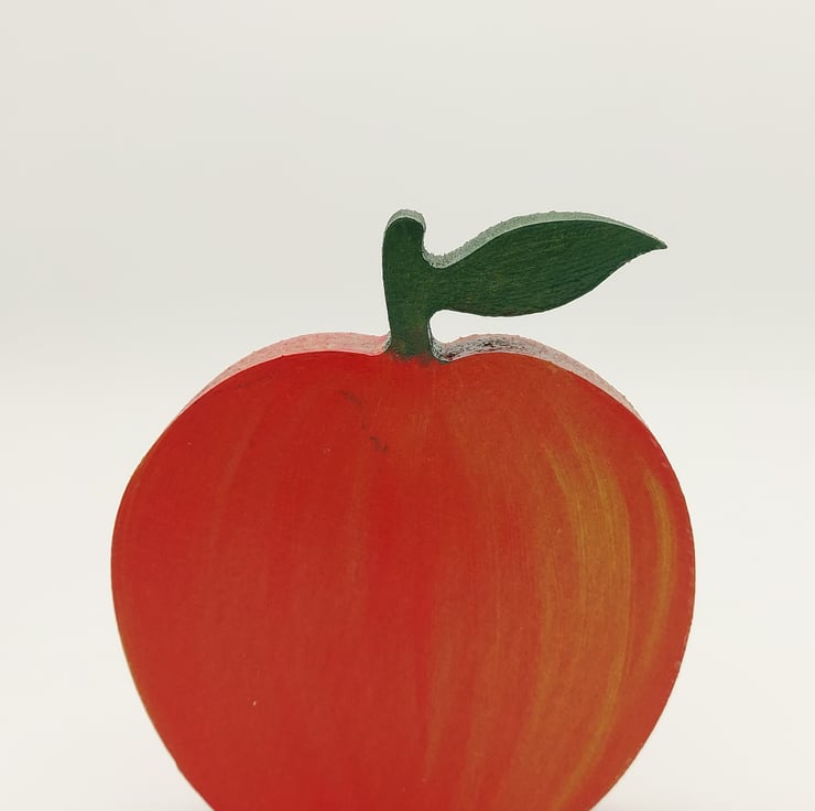 Free-standing wooden apple, hand painted in acrylic paint and sealed with a gloss varnish.