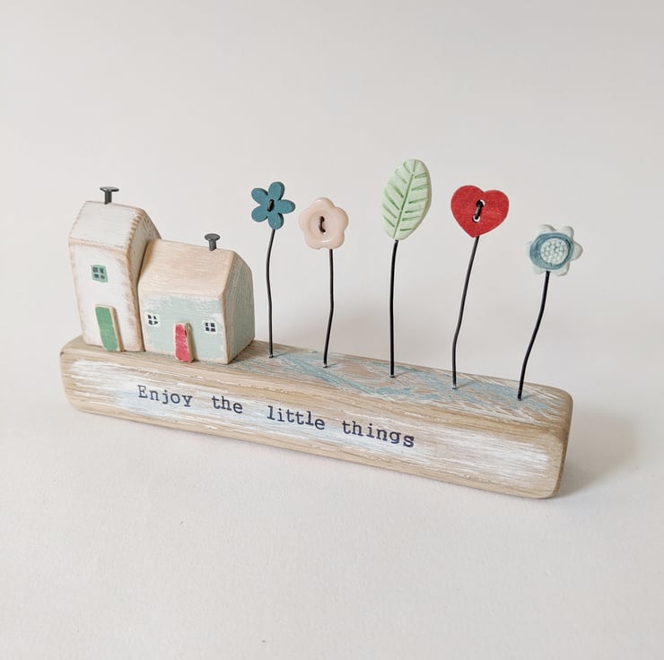 They sit on a painted wooden block and on the front are the hand stamped words 'Enjoy the little things'.