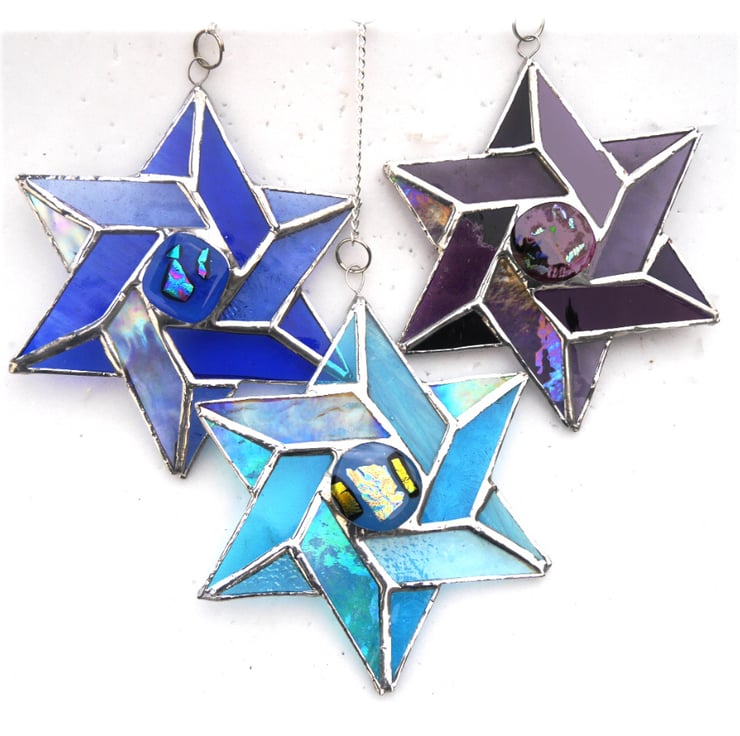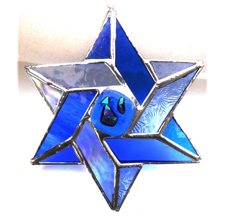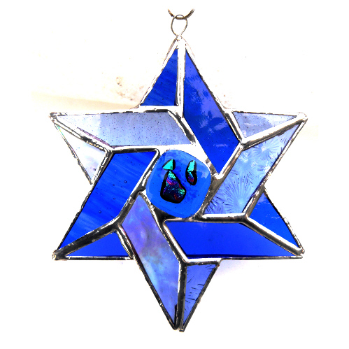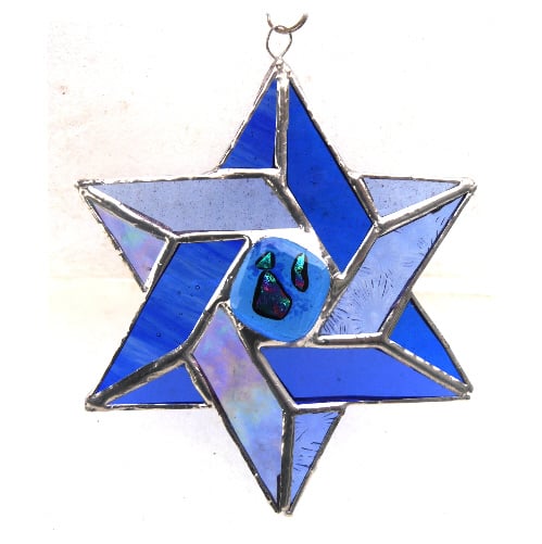 A Star of David in 6 shades of blue glass formed from 2 intertwined Celtic triangles. I have filled the centre with a gorgeous glass nugget topped with precious dichroic glass which I fused in my kiln.