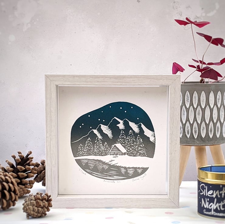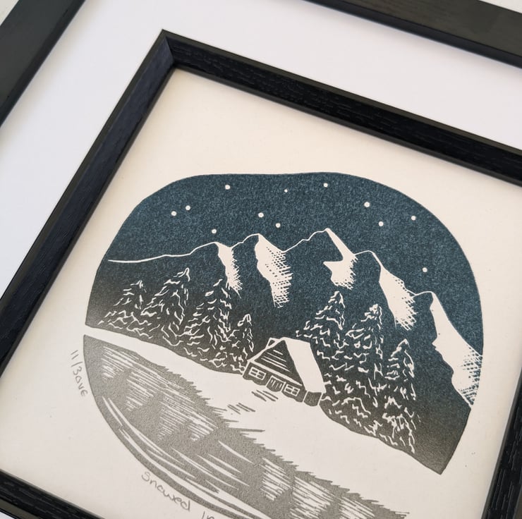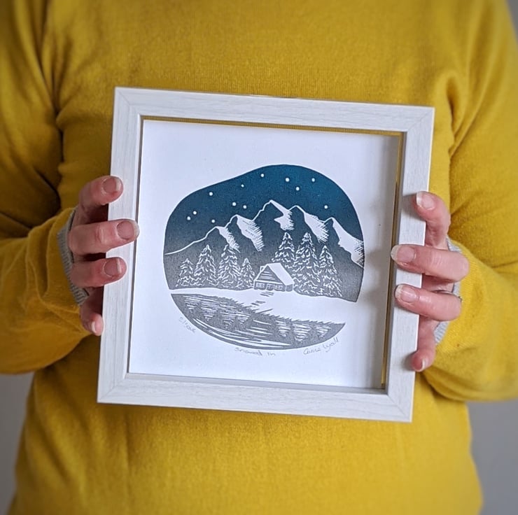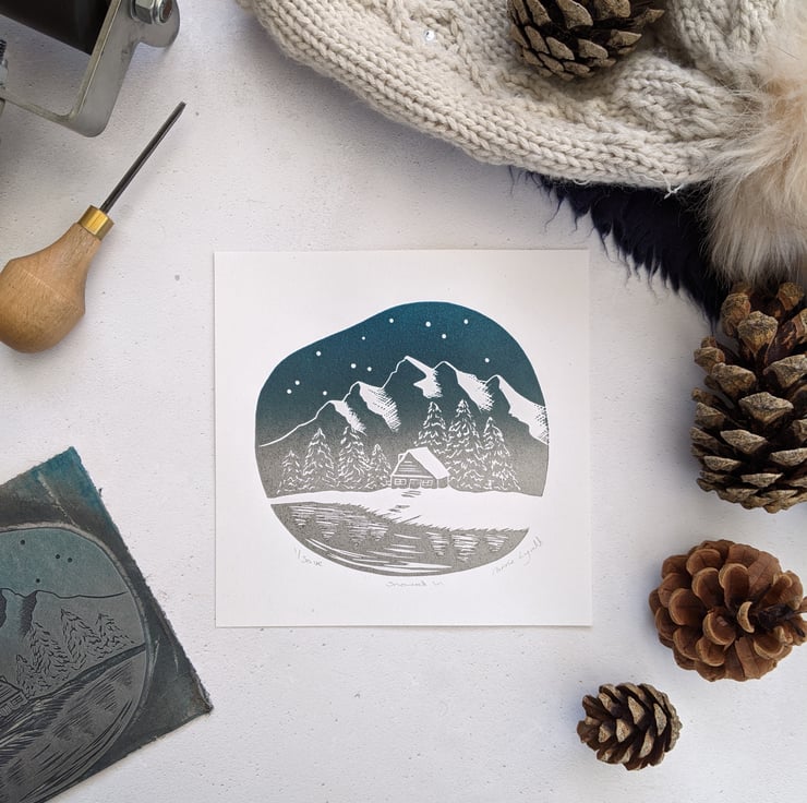 What could be better than snuggling up on a cosy cabin, with snow capped mountains in the background. Well now you can imagine yourself there any time of year with this lovely limited-edition linocut print.