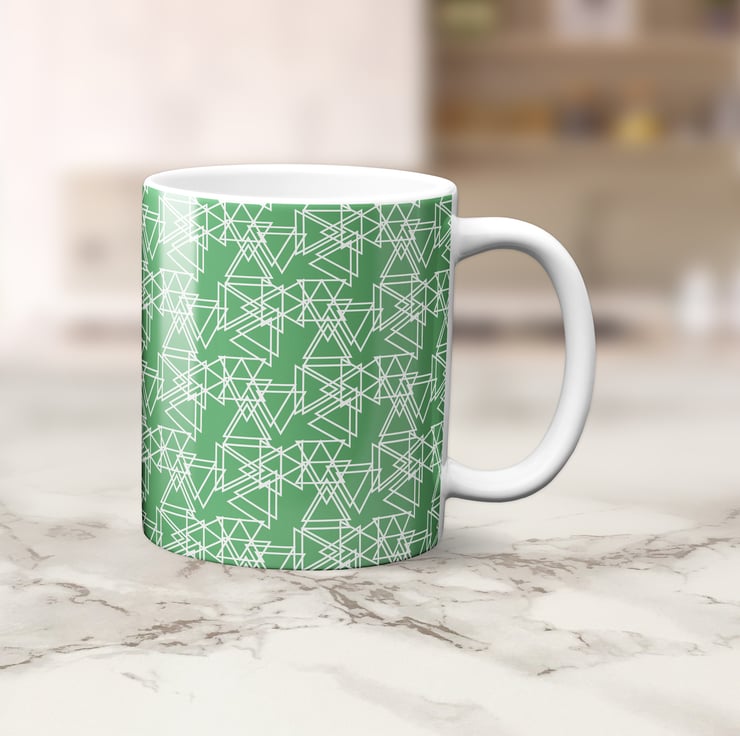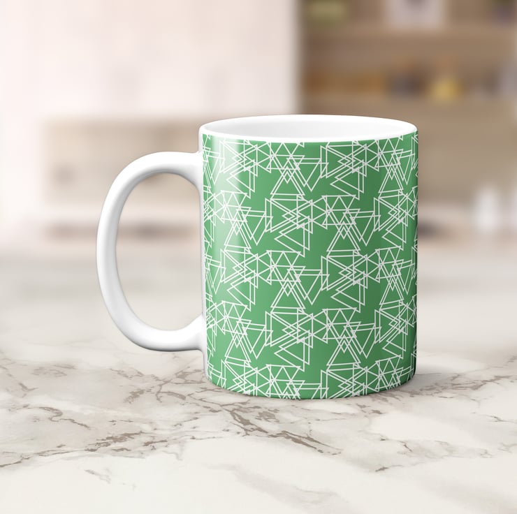 A ceramic mug in an attractive green colour with an original white triangle geometric design by Shadowbright.