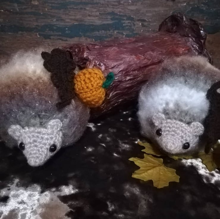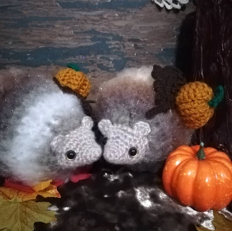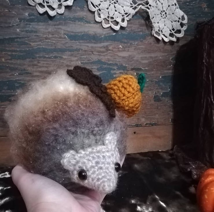 These limited edition jumbo sized puffs are made using a beautiful fluffy and twinkle yarn. They have a little pumpkin and oak leaf attached, and gold eyes.