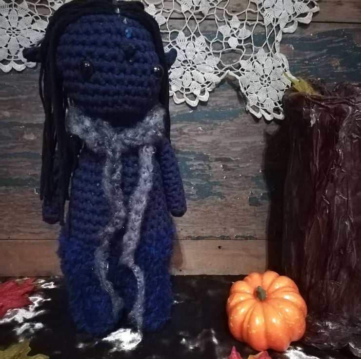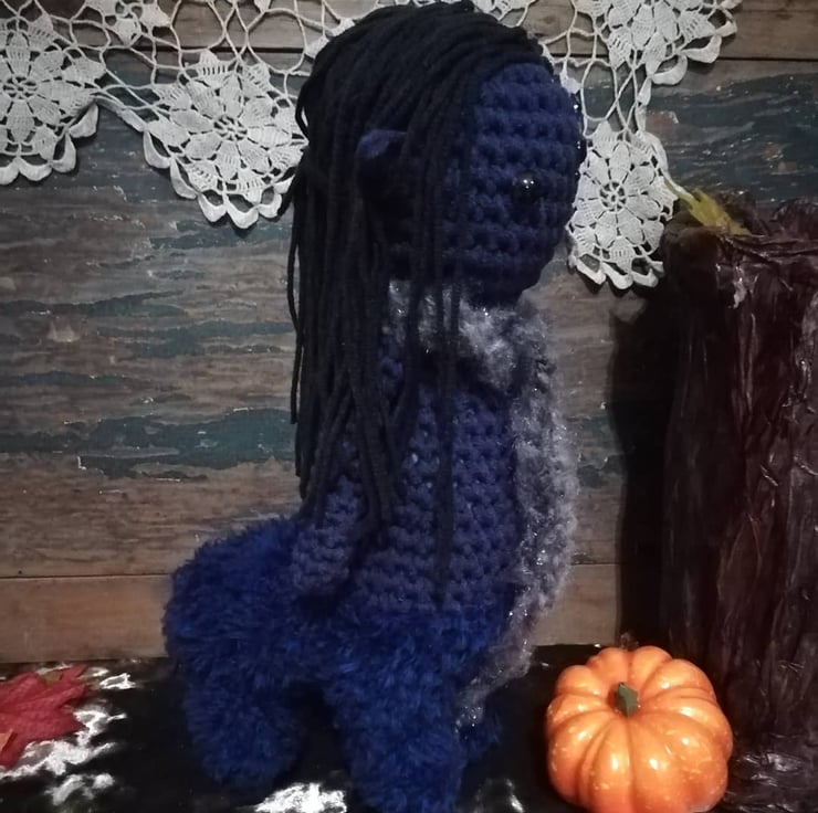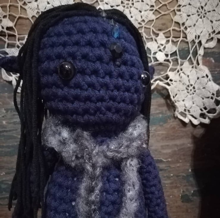 This one of a kind centaur is made from a dark blue cotton and he has crystals on his head, and a magical scarf.