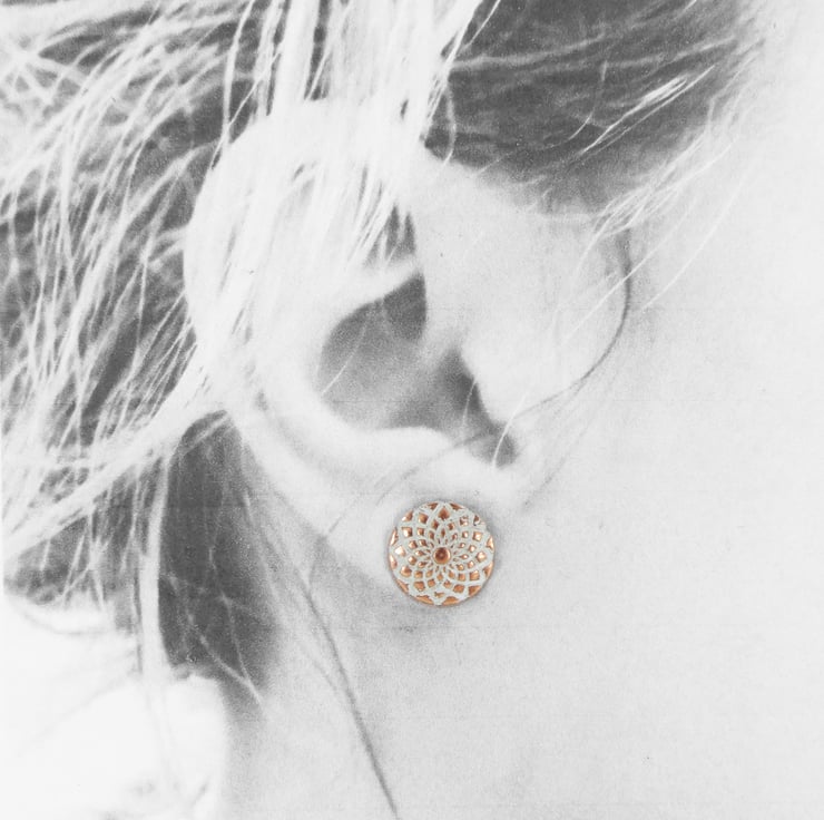 13mm circle copper stud earrings decorated with a dream catcher spiral stamp, domed and washed with white enamel. Some raised areas are sanded back to reveal the copper beneath. Silver posts are soldered on the backs. Fired in the kiln at 830 degrees. Posted out in a gift box with information about the enamelling process.