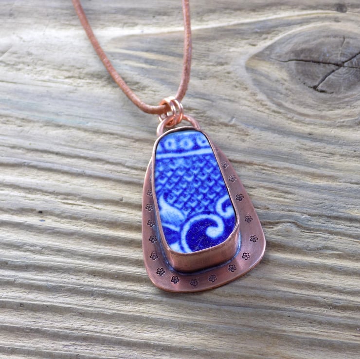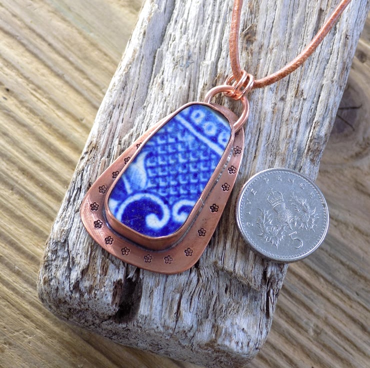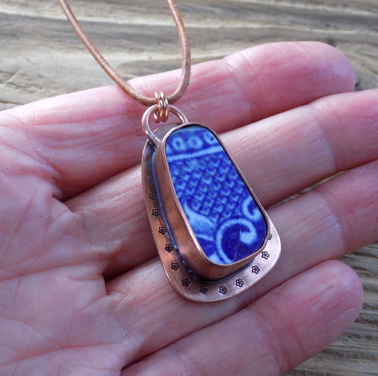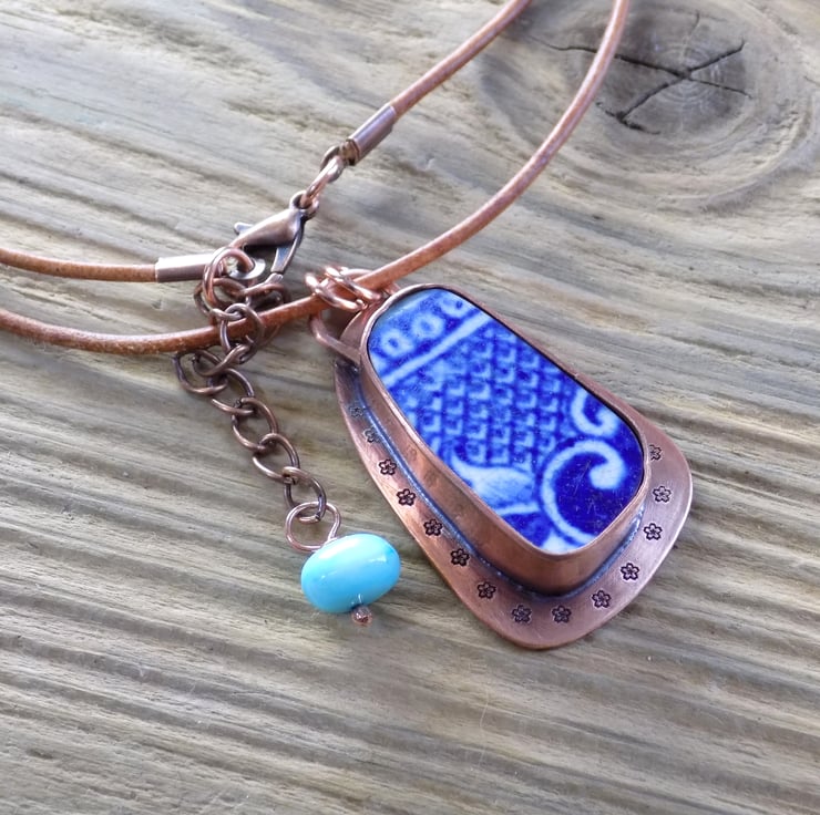 Made from copper and Victorian blue and white pottery collected from the Thames foreshore. This piece of pottery has been specially selected from a larger piece, cut to shape and sanded to fit a custom made made copper bezel. The edges of the pendant have been stamped with tiny little flowers and the whole pendant has a rustic aged look. Suspended on 1.5 mm thick vintage brown leather cord. Adjustable from 18-20".