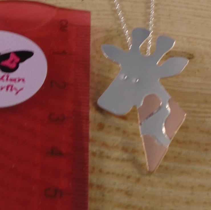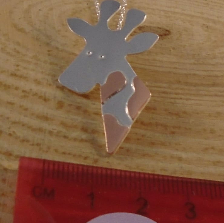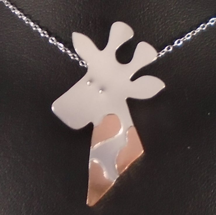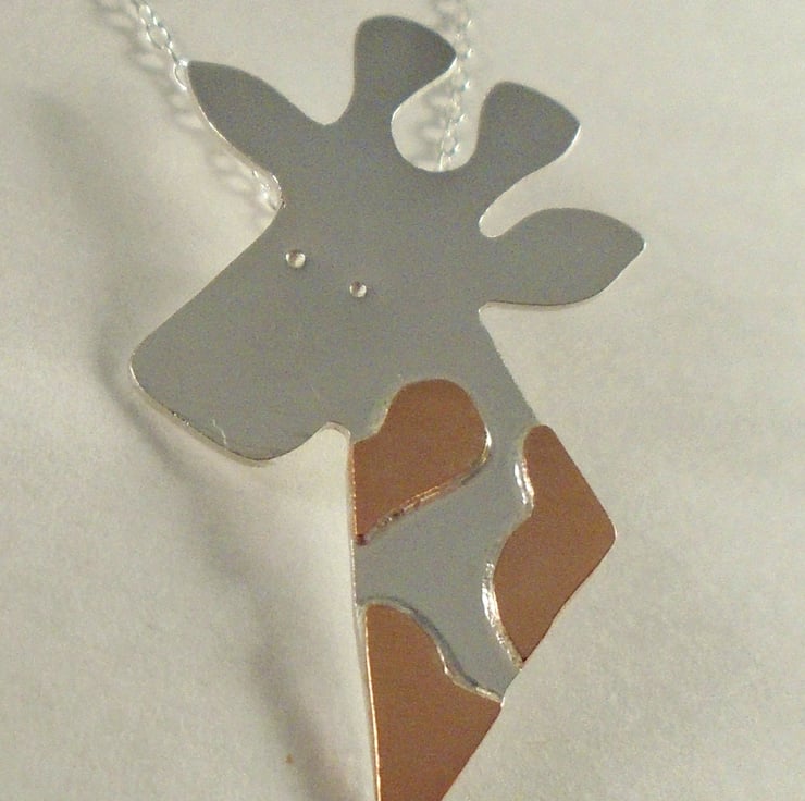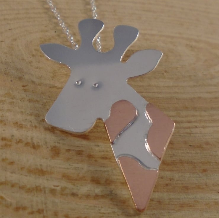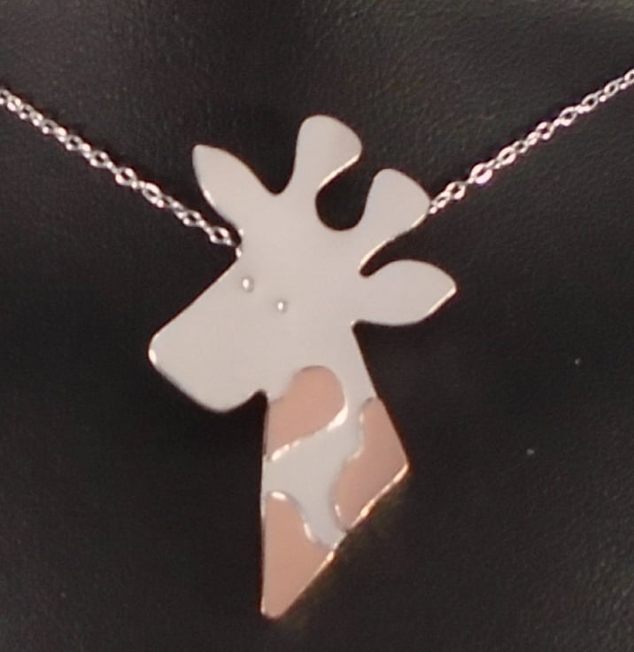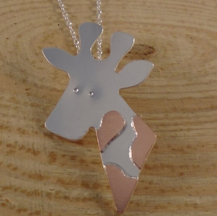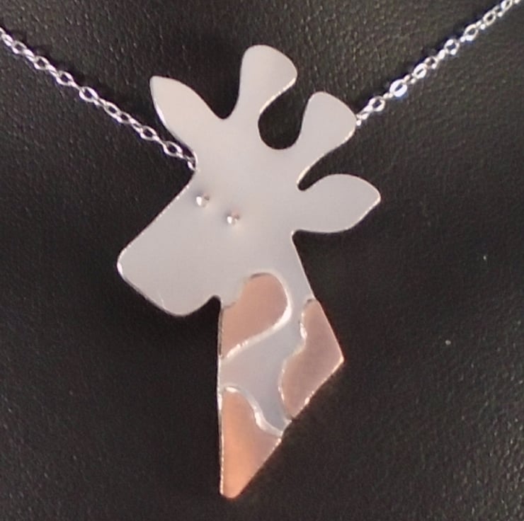 A quirky, statement giraffe necklace, hand made from sterling silver and copper. The shape of the giraffe head and neck has been hand pierced from a sheet of silver. The spots of the giraffe have been pierced from copper and soldered on. A loop has then been soldered to the back for the chain.
