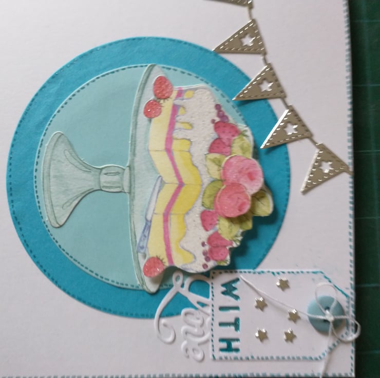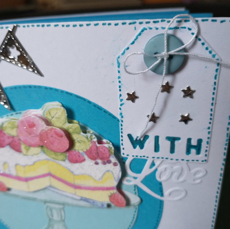 A completely handmade and uniquely designed card. Consisting of a Victoria sponge cake on cake stand decoupage. Mounted on two circles of turquoise card and then onto pristine white quality card. With love tag embellished with stars and a button. Finished off with silver bunting