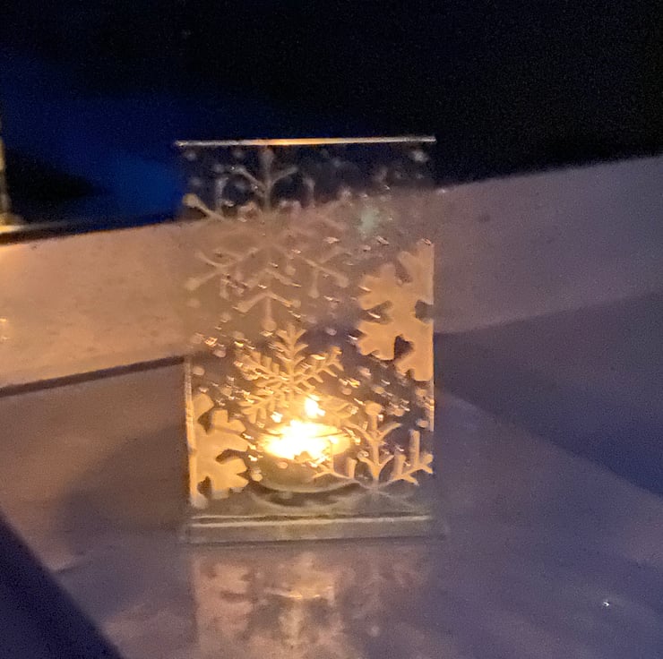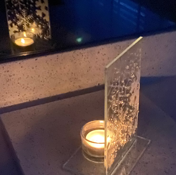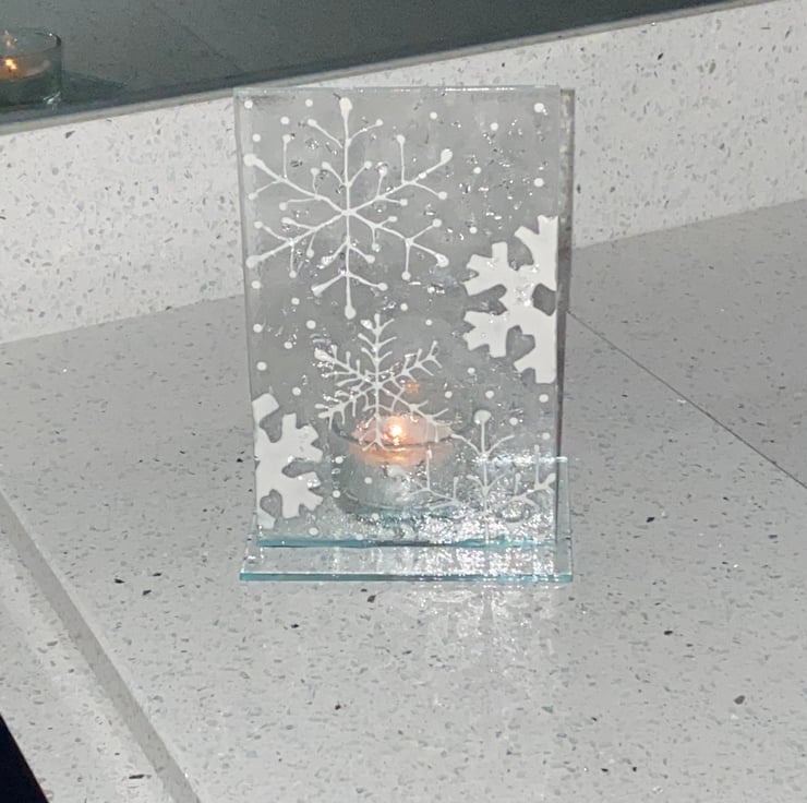 Fused glass snowflake candle screen . clear panel with enamelled snowflakes and iridescent clear glass on a glass base with glass candle holder . Size 6 in tall x 4 in Wide. . It looks pretty and decorative during the day but really comes alive at night. These are made to order items so slight variations will occur due to the hand made nature of the item .