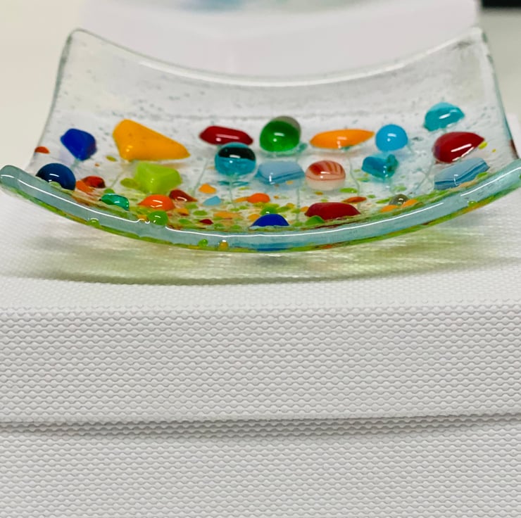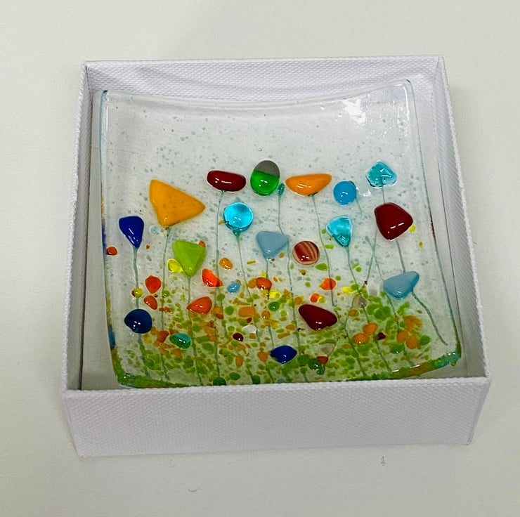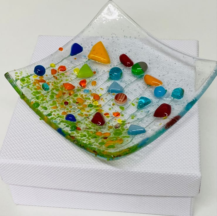 3 dimensional meadow trinket dish in bright cheerful colours . A beautiful small gift and perfect for keeping rings and earrings safe and looking pretty at the same gime . Presented in a quality white gift box . Approximate size 3.5 in square