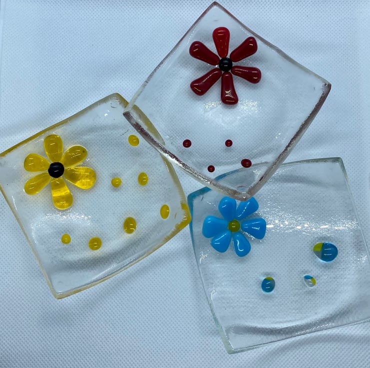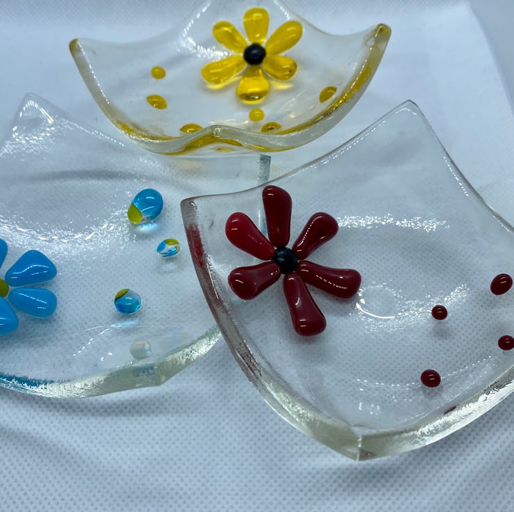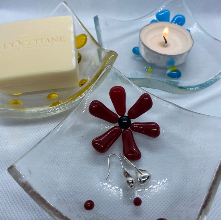 These square trinket dishes are available in yellow, red or blue as seen in the photos. Measuring 9cm x 9cm, they are the perfect size for jewellery and trinkets, tea light candles or as small soap dishes.