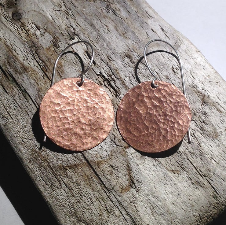 These lovely earrings have been handcrafted from copper discs which have been given an attractive hammered finish.